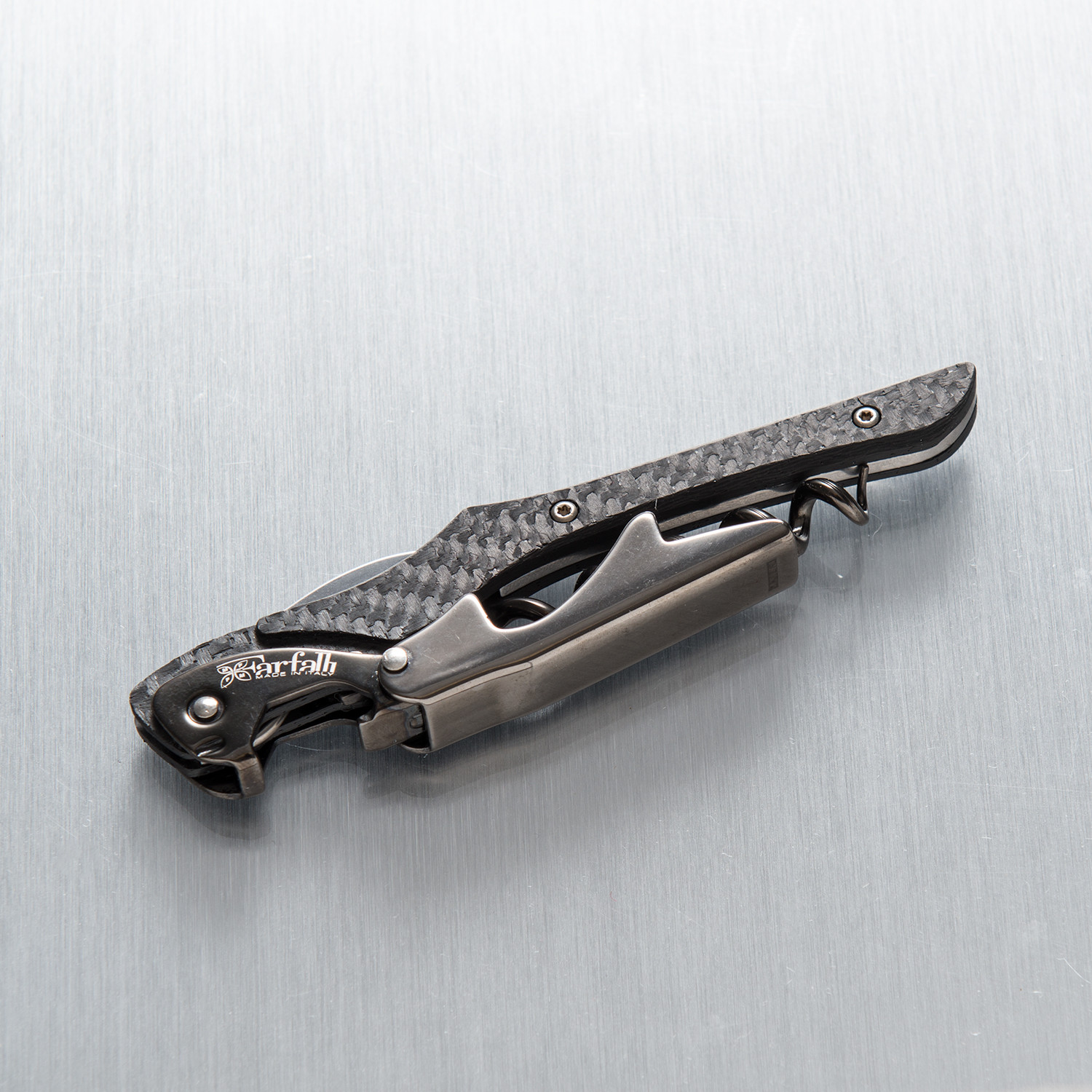 The Gulliver Special Edition Carbon Fiber Corkscrew by Farfalli has stainless steel metal parts that are treated with Physical Vapor Deposition (PVD), a luxury coating that is extremely wear resistant. PVD-treated stainless steel surfaces are highly resistant to wear, discoloration and corrosion. Widely used by Formula One (F1) to treat the internal metal parts of the engine and commonly applied to luxury watches, it adds a unique professional appearance.