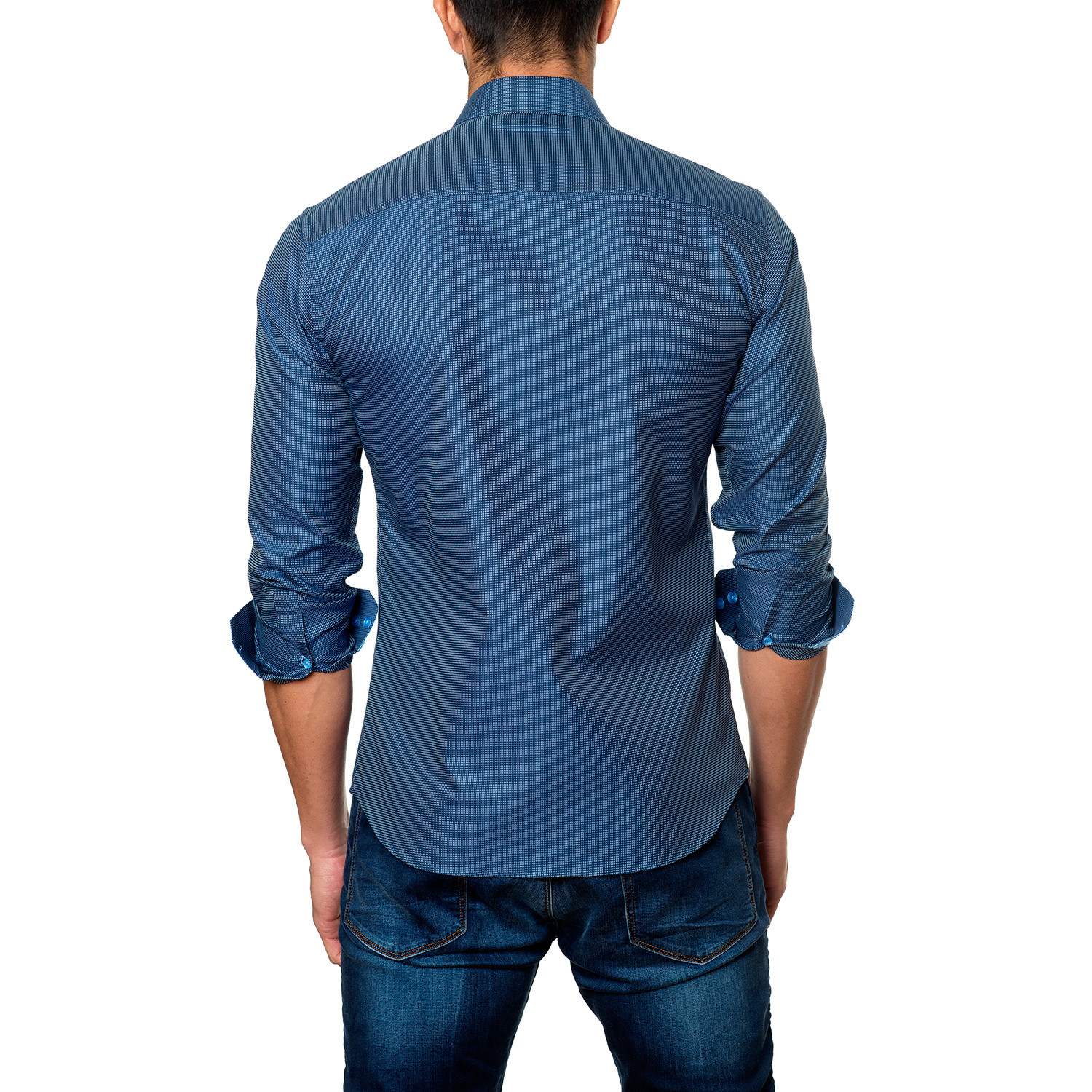 This semi-fitted long sleeve button up features tailored trimming inside of the collar, cuffs, and button column. This crisp shirt pairs well with fitted pants that you can wear to work or go out in.
