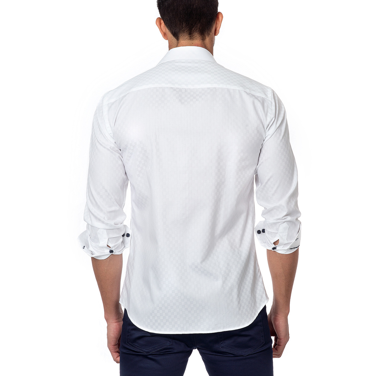 This semi-fitted long sleeve button up features tailored trimming inside of the collar, cuffs, and button column. This crisp shirt pairs well with fitted pants that you can wear to work or go out in.