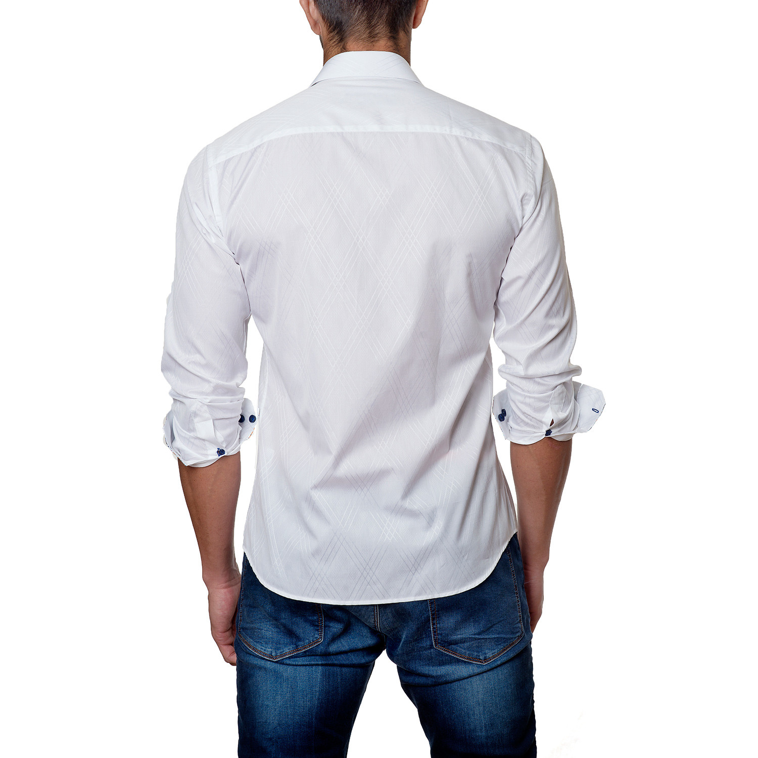 This semi-fitted long sleeve button up features tailored trimming inside of the collar, cuffs, and button column. This crisp shirt pairs well with fitted pants that you can wear to work or go out in.