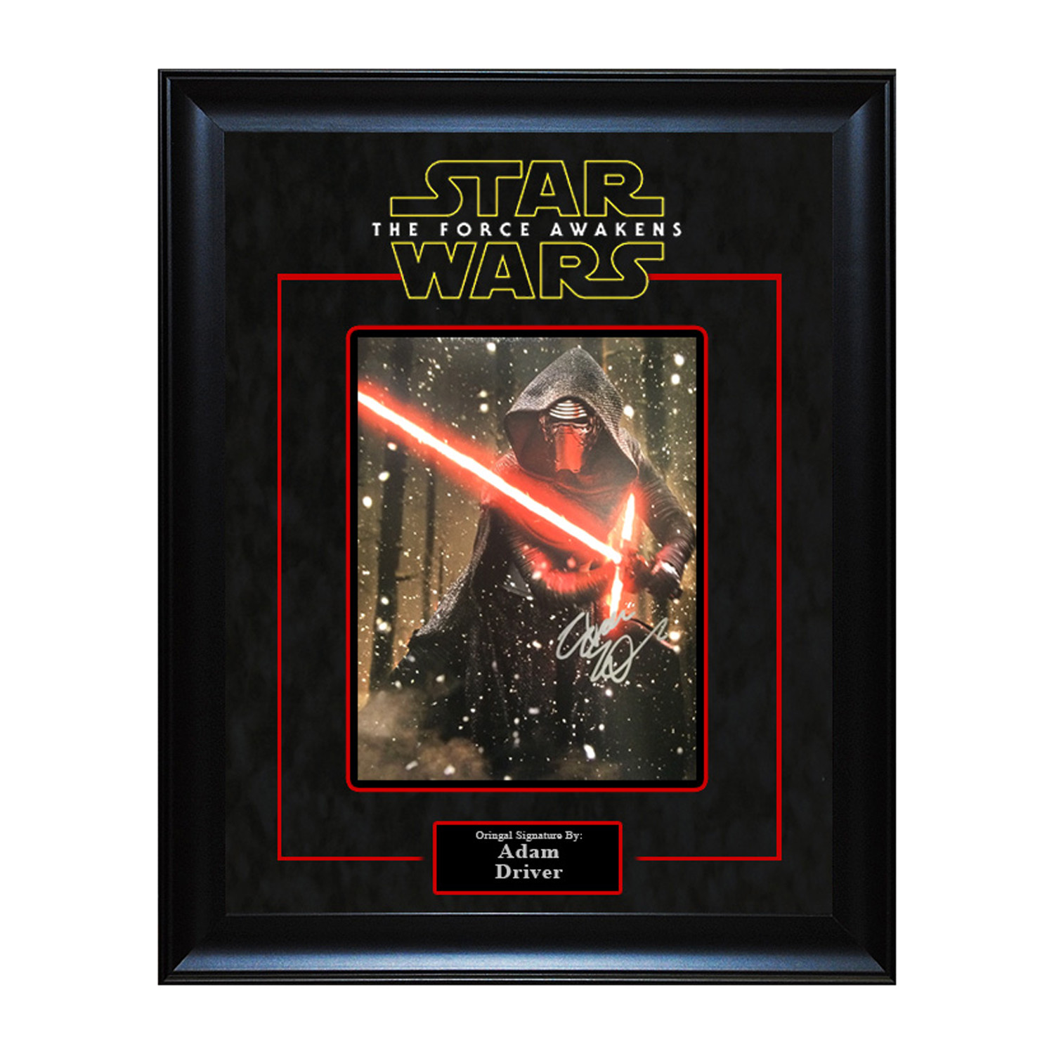 This Kylo Ren Signed Photo features a black backdrop and a 3-D cutout of "Star Wars." It's a classic photo of Kylo Ren, signed by Adam Driver himself.