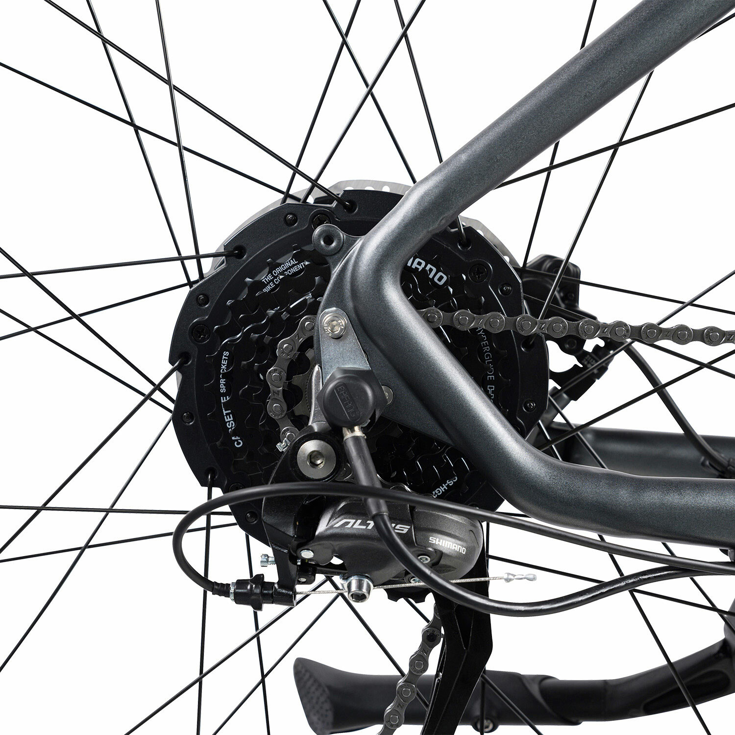 The 8-speed SHIMANO ALTUS M370 rear derailleur uses its Mega 8-drive train design to deliver smooth, light action shifting performance. For reliable mountain bike shifting, SHIMANO's SL-M315 Rapidfire shift lever is suited to quick shifting, giving riders the ability to downshift three gears in one stroke.