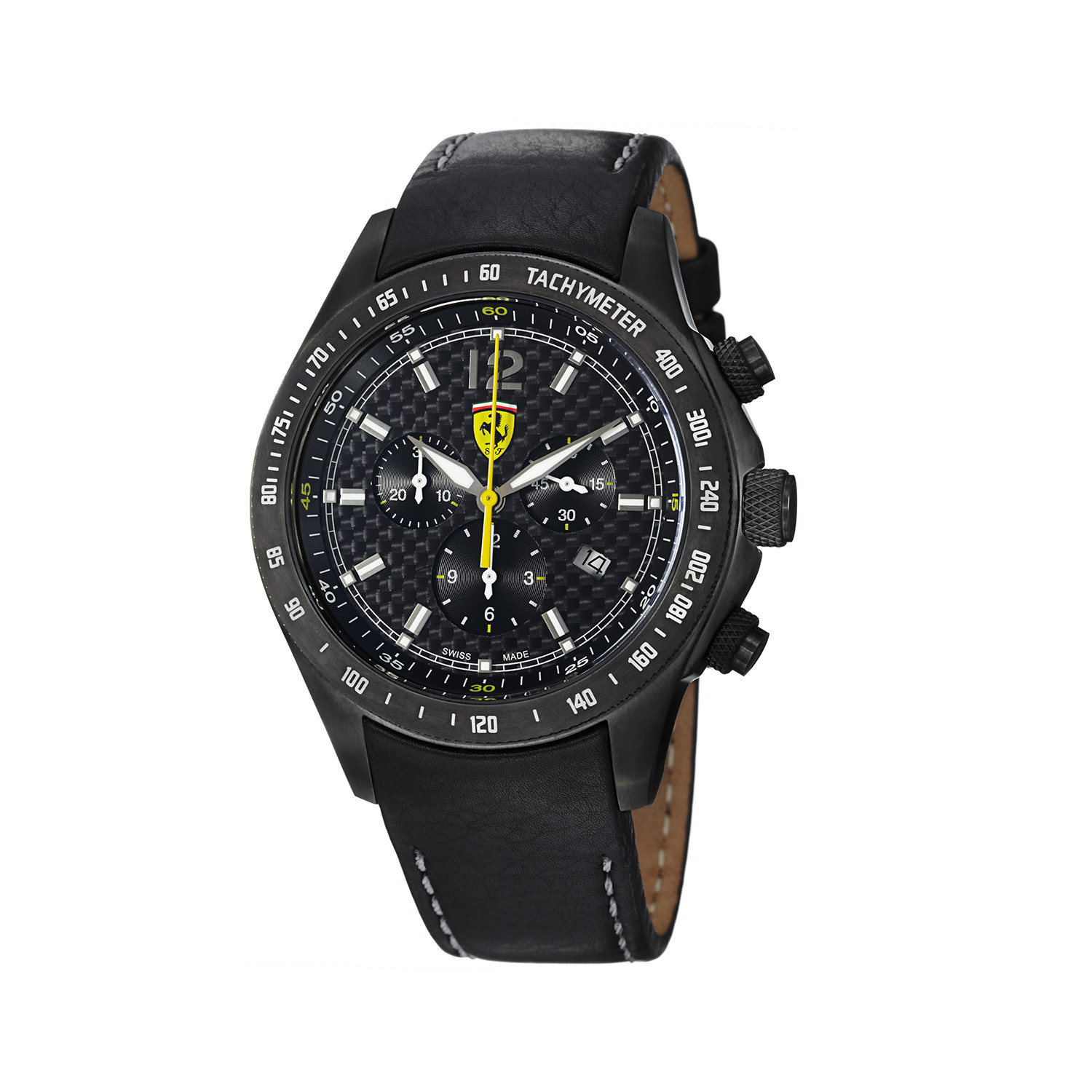 The Scuderia Chronograph, Ferrari's most classic watch line, boasts a timeless style with traditional male details, including its 44 mm case. The chronograph movement features a sweeping seconds hand motion as opposed to the traditional tick motion. The double-layer dial creates a depth effect while the tachymeter indicator on the knurled bezel gives it an extreme-sport look. The leather wrist strap with integrated belt is the height of practicality and has a very trendy look. It is water-resistant up to 5 ATM and comes with a 2-year international warranty.