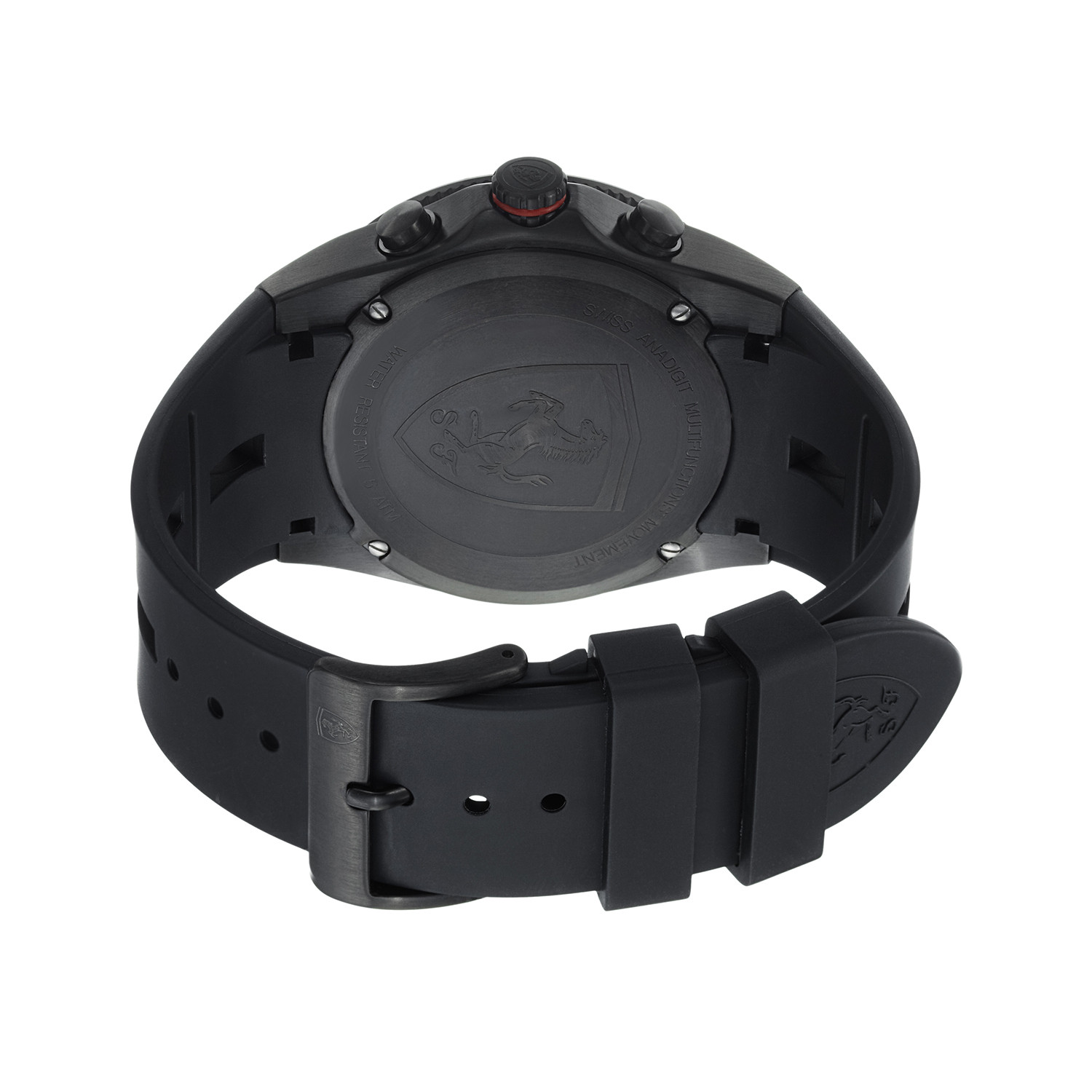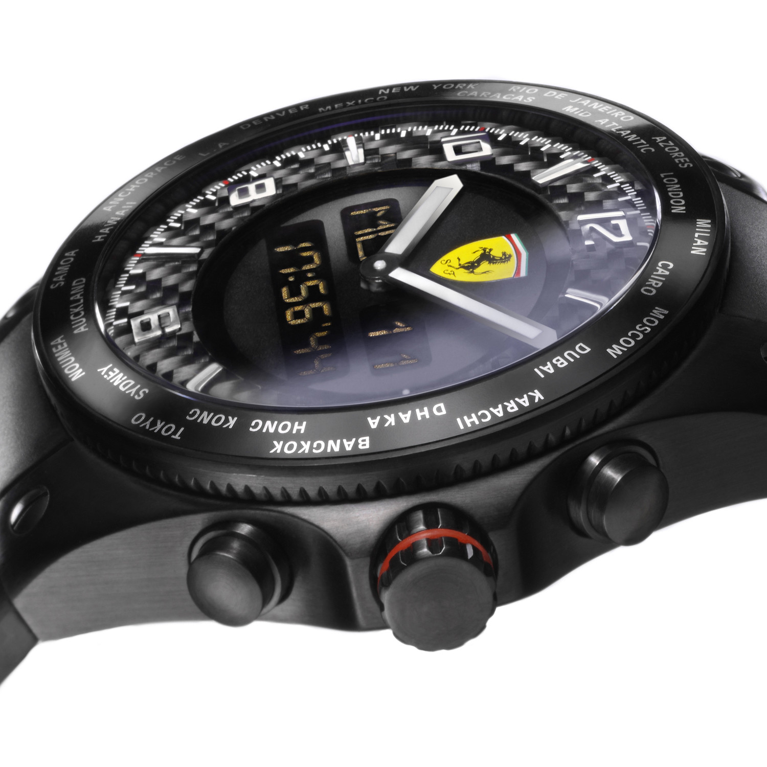 Ferrari's trademark color scheme and style is clearly evident in the World Time's case, bezel, dial, strap, hands and crown, which have been augmented with yellow, silver, and black. The end result is a sporting style that is just as streamlined as a superior racecar.
