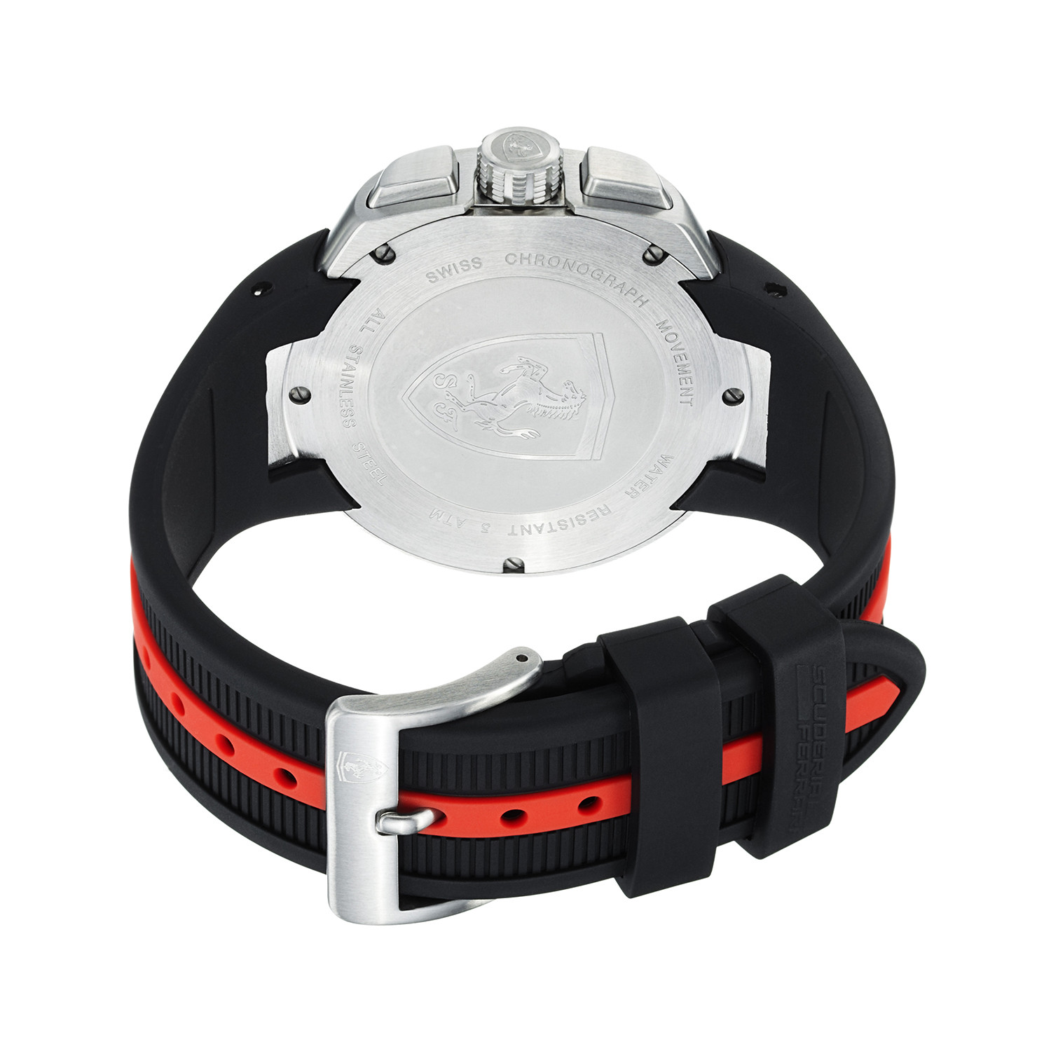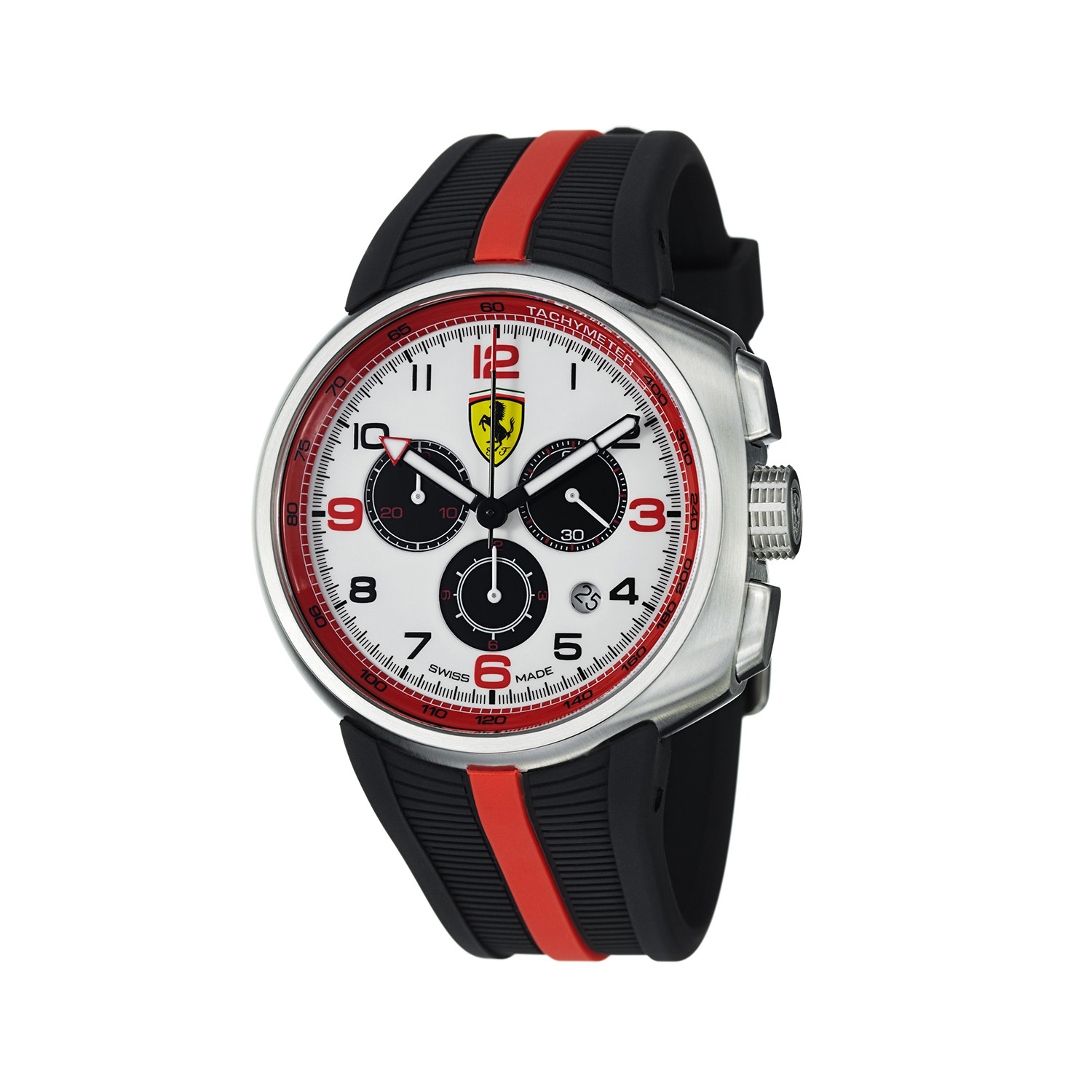 This Ferrari watch of the new F1 Fast Lap collection is an exclusive product for true fans of the vehicle manufacturer from Maranello, a chronograph that perfectly combines the stylistic elements of Ferrari logo: elegance, performances and strong sports character. This Ferrari watch is made unique by the details like: the dial in carbon fiber with the Shield of the "Cavallino Rampante," also engraved on the central button on the side; the rubber strap with motif in color contrast, the buckle in steel and anti-glare glass.