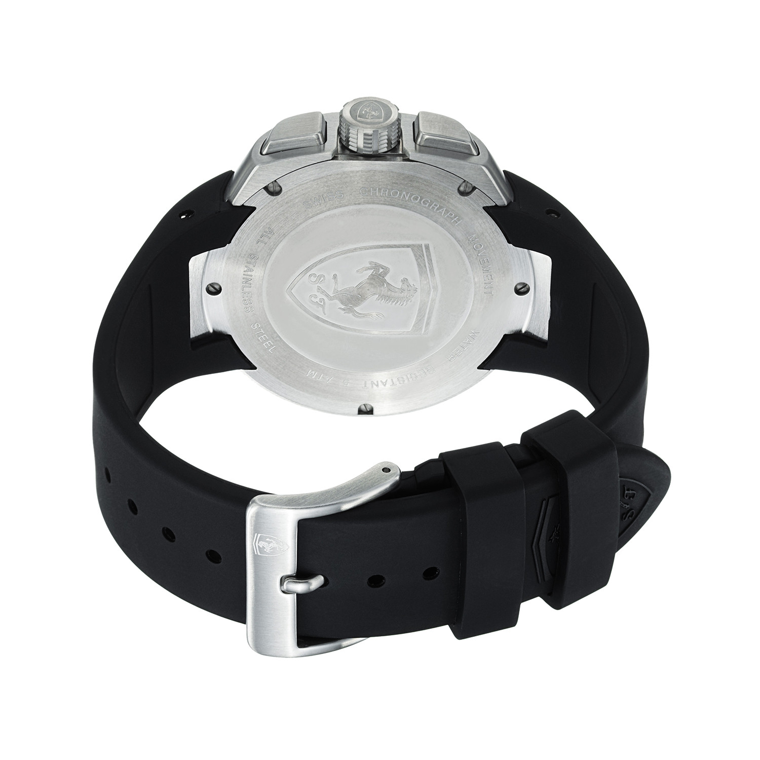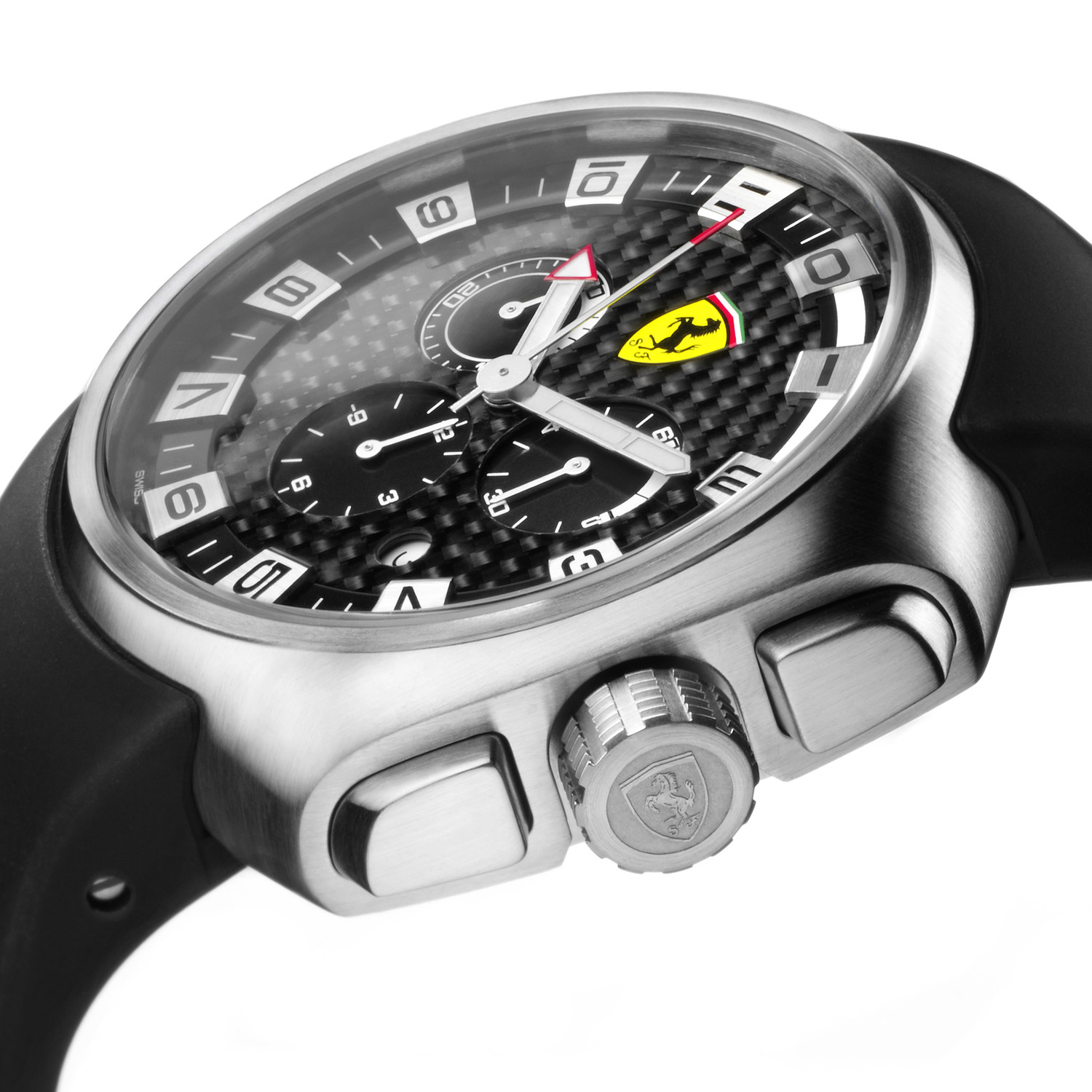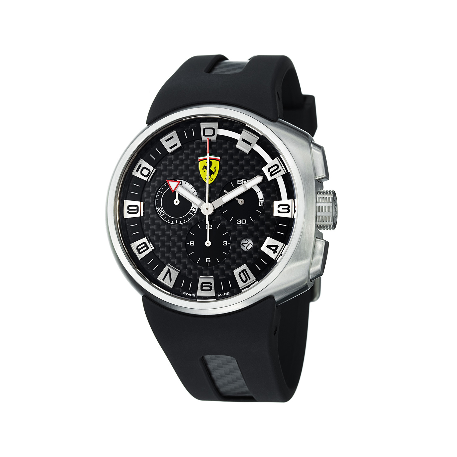 Technology, performances, always pushing to the limit. The values that drive Scuderia Ferrari are instilled in Ferrari F1 Podium chronograph, a unique accessory in its kind in terms of sports character and exclusivity. This watch is characterised by the steel case, the yellow dial, anti-glare glass, the rubber strap with inserts in carbon fibre and steel buckle. Ferrari F1 Podium watch also stands out for its waterproof rating up to 5 atm.