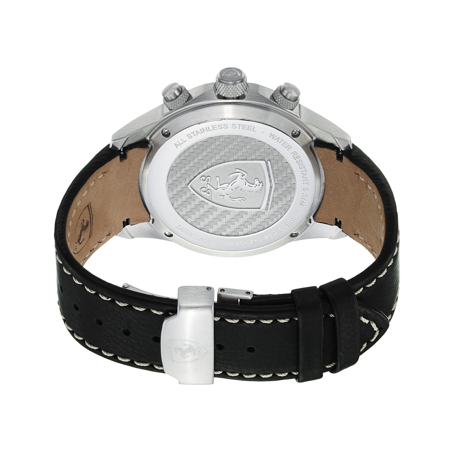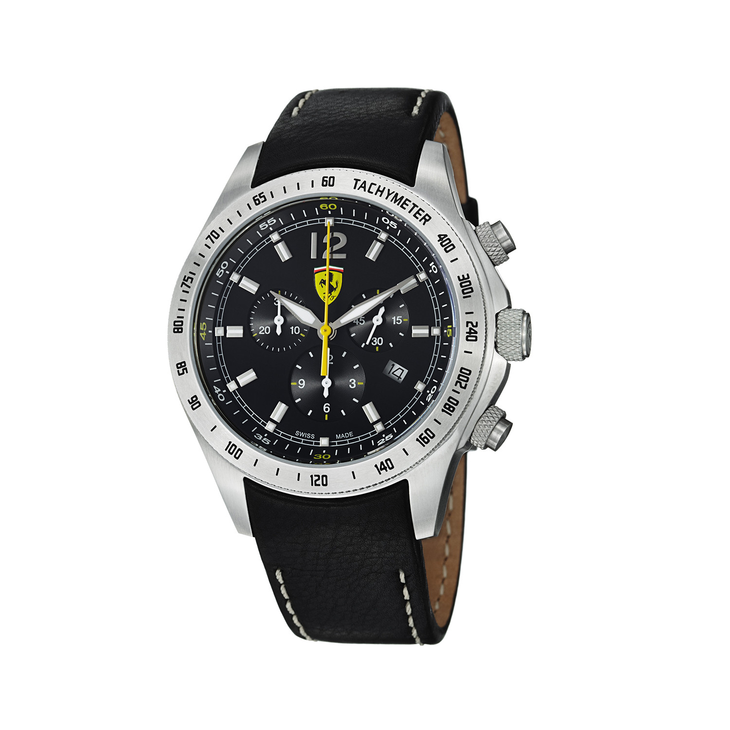 The Scuderia Chronograph, Ferrari's most classic watch line, boasts a timeless style with traditional male details, including its 44 mm case. The chronograph movement features a sweeping seconds hand motion as opposed to the traditional tick motion. The double-layer dial creates a depth effect while the tachymeter indicator on the knurled bezel gives it an extreme-sport look. The leather wrist strap with integrated belt is the height of practicality and has a very trendy look. It is water-resistant up to 5 ATM and comes with a 2-year international warranty.