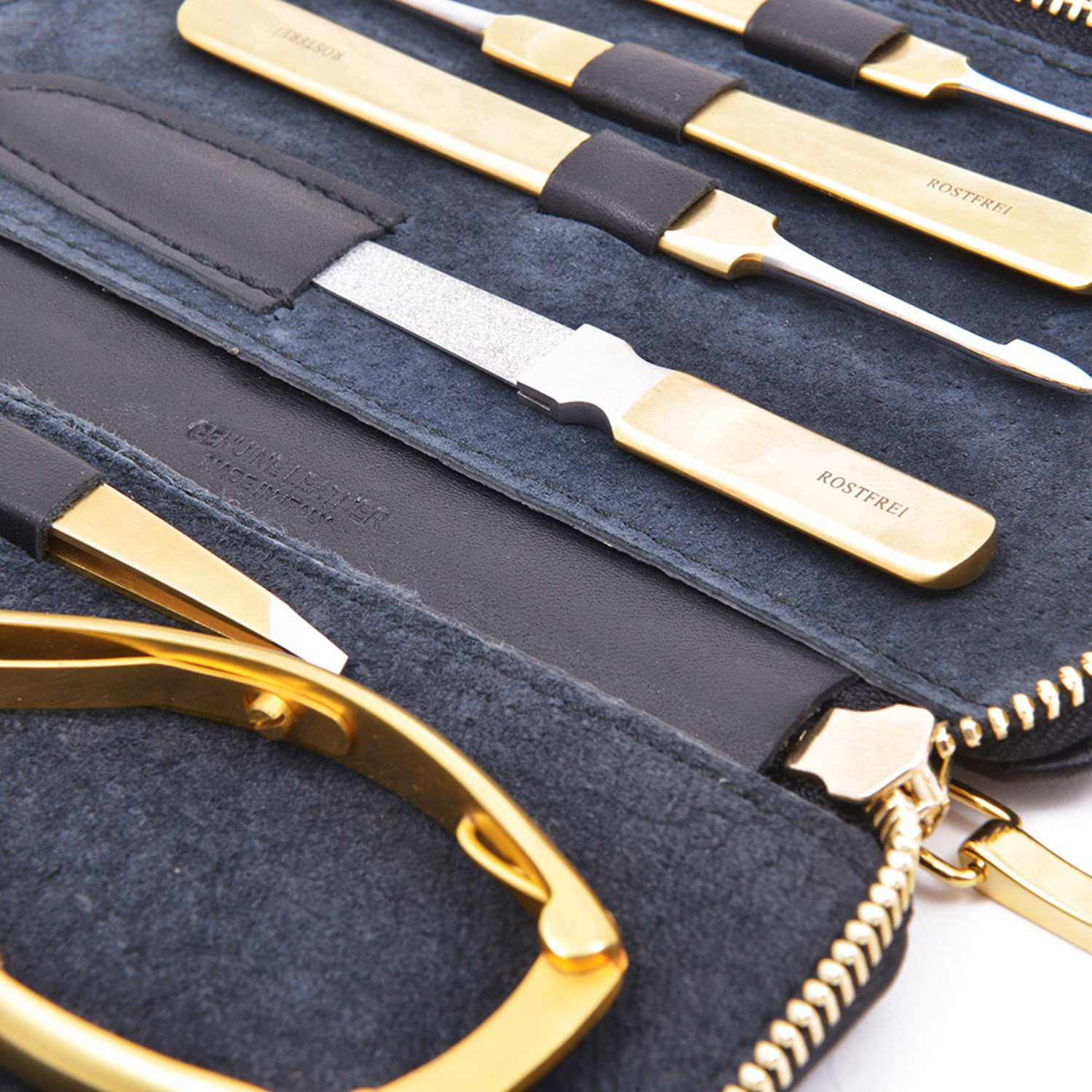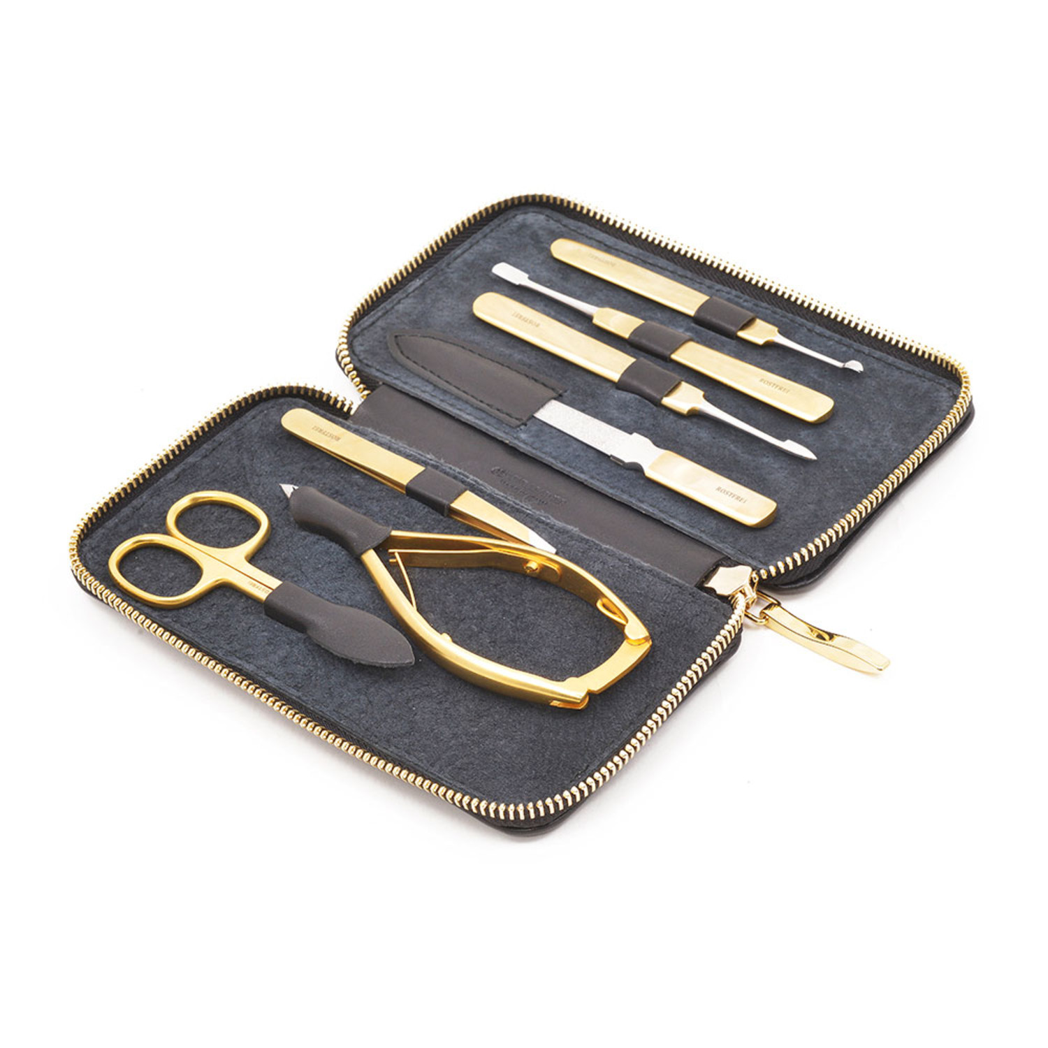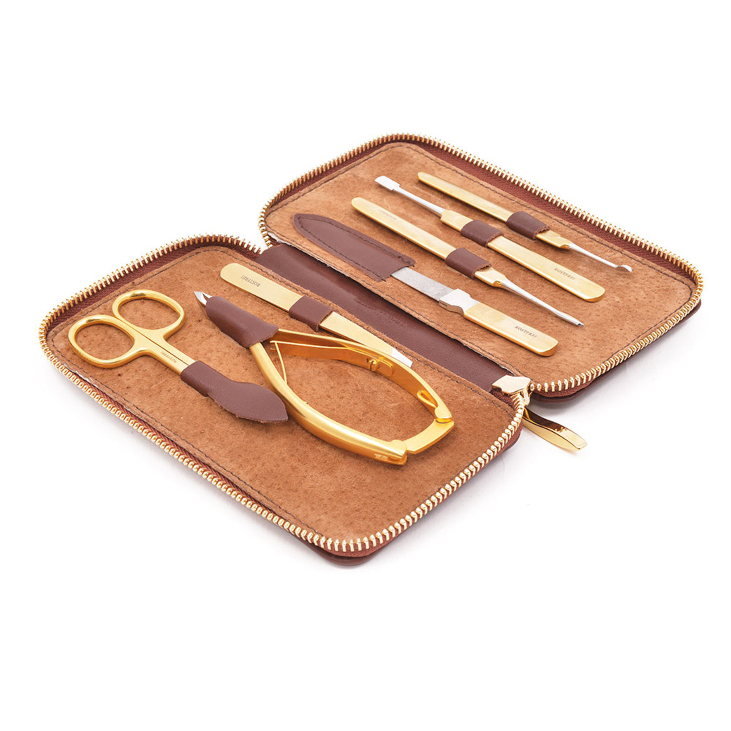 Stay looking sharp on the road with this Manicure Set 2 from Ferruccio Laconi. Realized in vegetable tanned full grain calf hide, it's a travel basic characterized by its top quality, all essentials included.