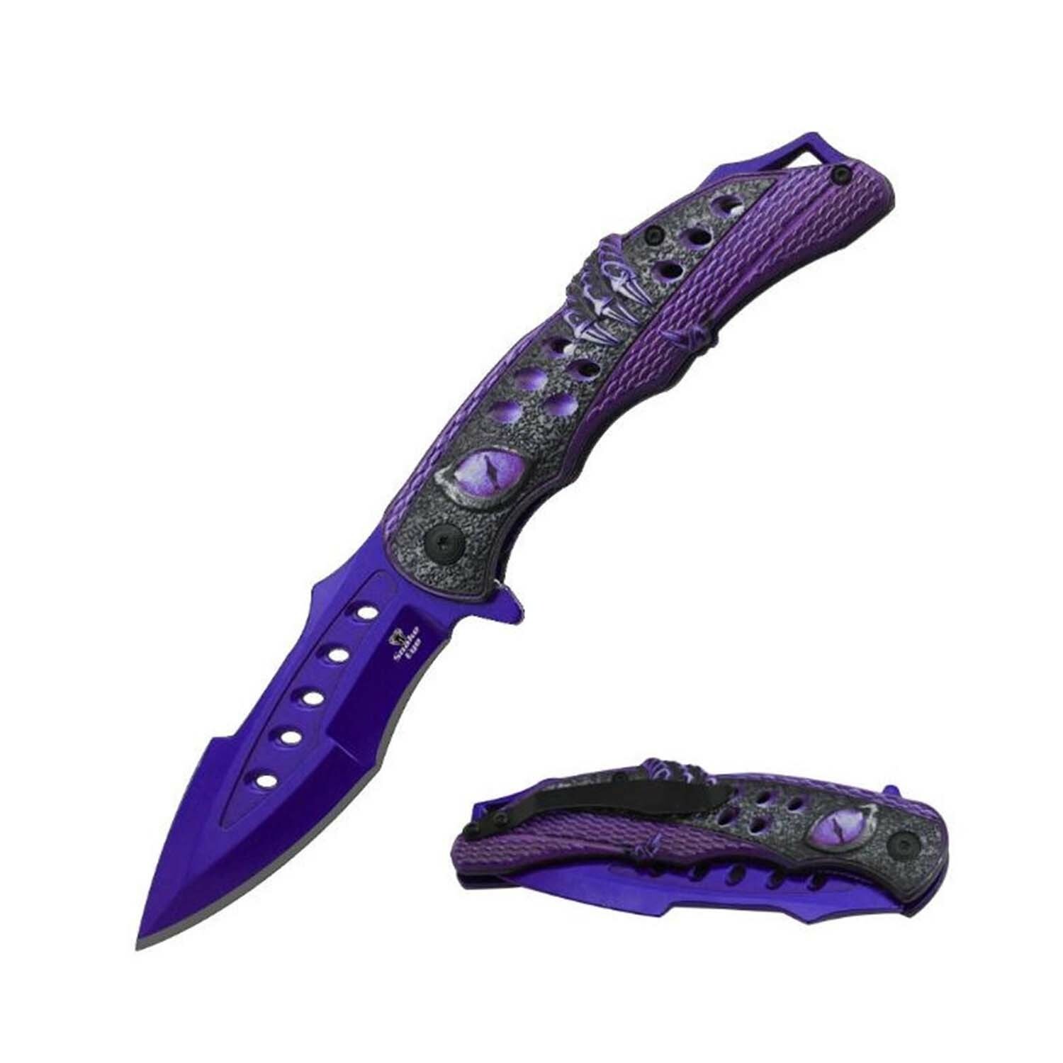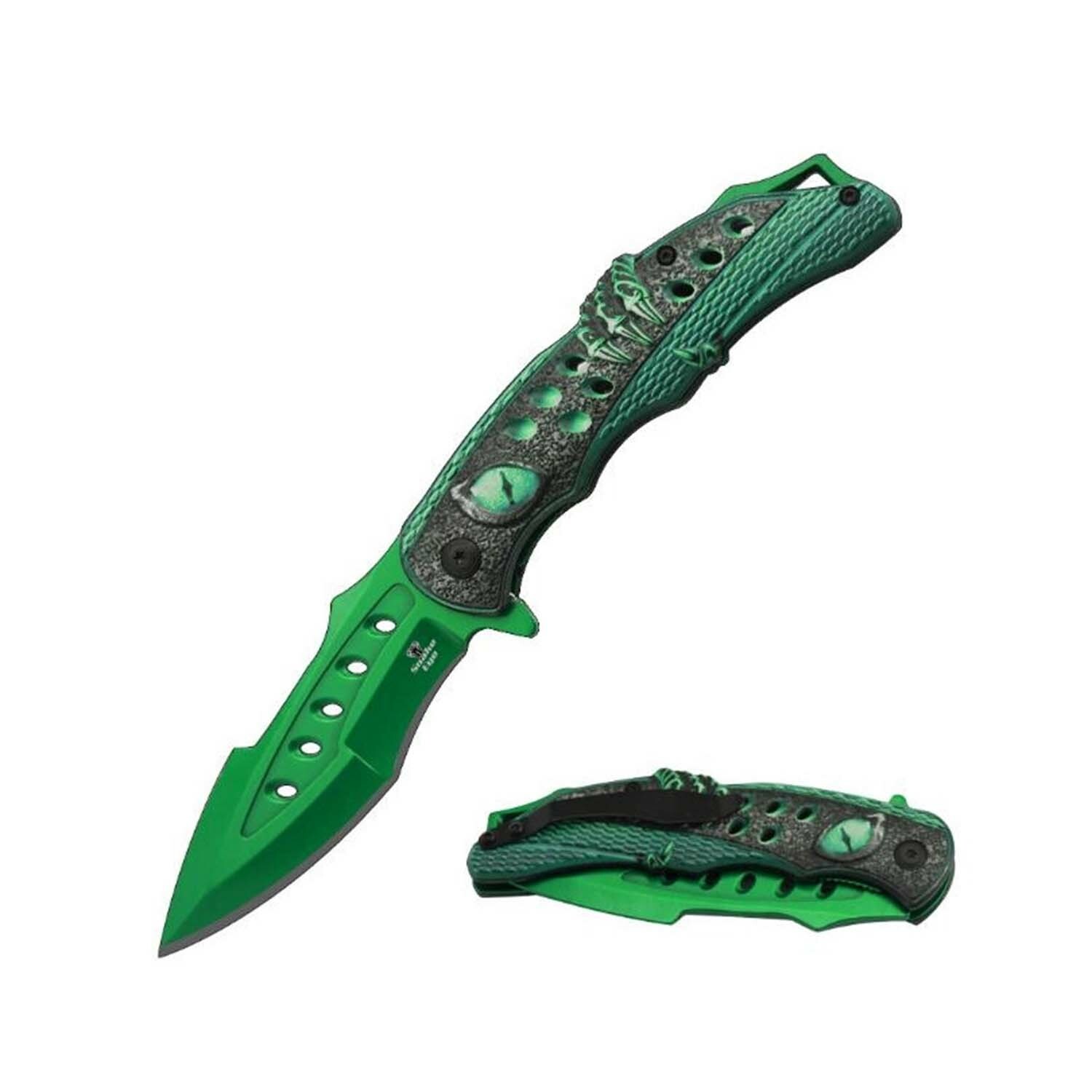 This collection of spring assisted pocket knives is built for fast, reliable one handed use with bold, graphic designs that stand out. Each piece features a tension driven opening mechanism for quick deployment, textured grips for control, and durable stainless steel blades suited for everyday tasks. From tactical profiles to statement finishes, these knives deliver dependable function and solid build quality at an easy entry price.