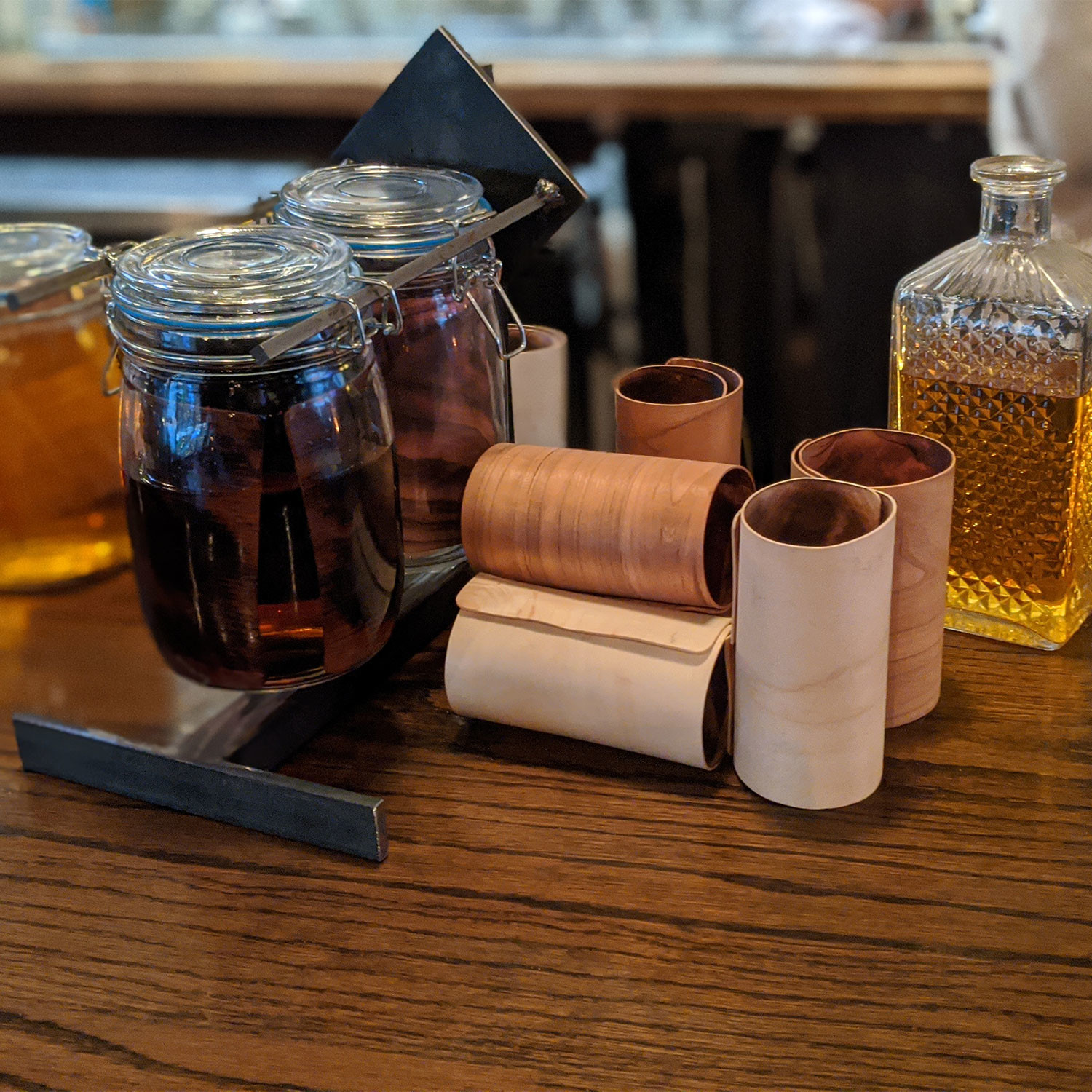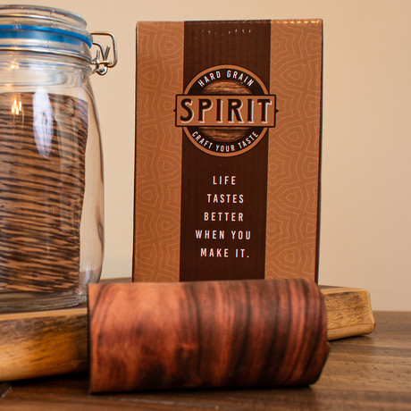 The American Traditional House Blender kit includes a glass jar and two American hardwood coils—White Oak and Cherry. These thin slices of wood have been charred on both sides, then steamed and curled to fit in a jar. When placed in a jar with your drink of choice, the wood rehydrates and the coil expands to fill the jar. Each wood coil is good for about four uses. Make the same thing four times or mix things up—the flavor of your first batch will add depth to your next creation.