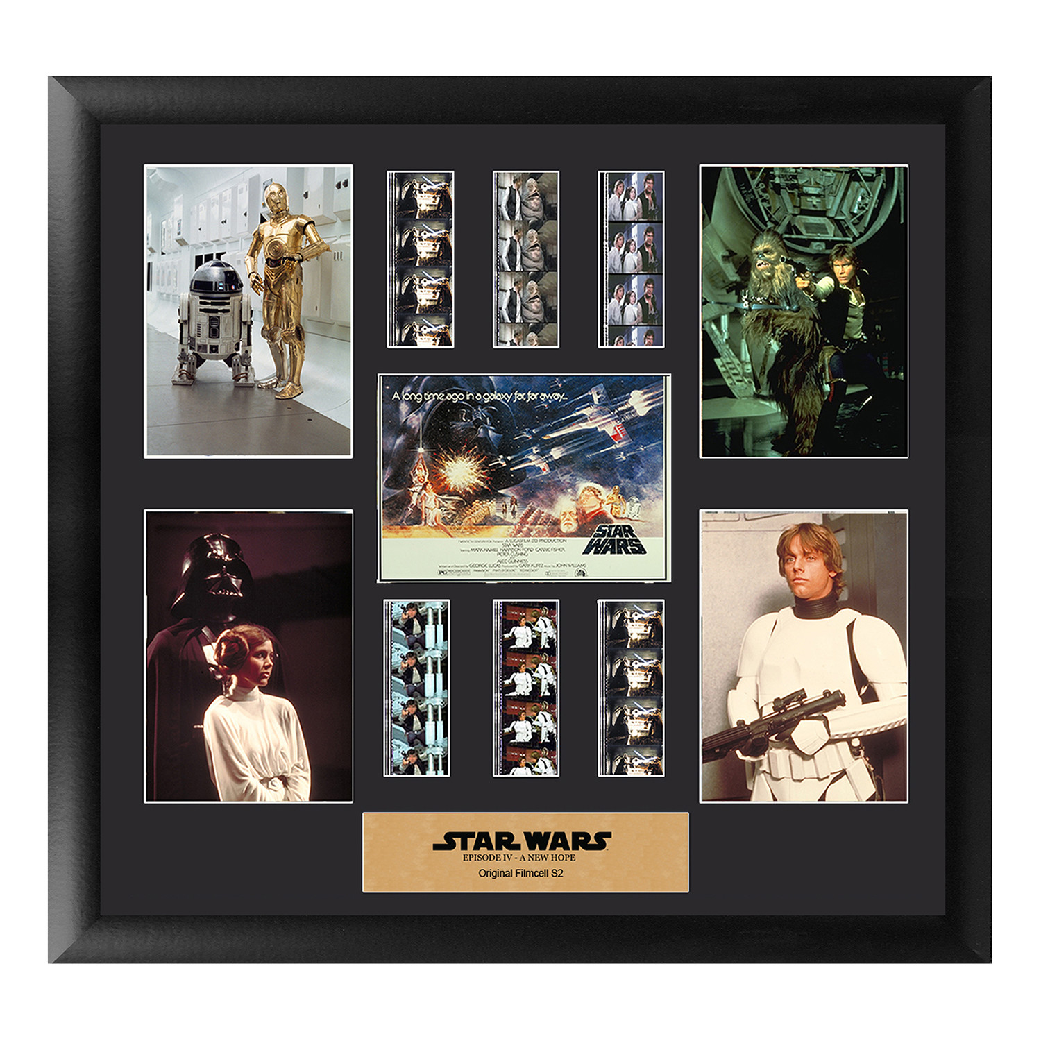 Bring a piece of the Star Wars saga to your home collection with this FilmCells™ Montage. Each one of these stunningly cinematic presentations is made with careful attention to detail. Double matted, and placed in a quality frame, this piece contains an acrylic front and back that allows natural light to enhance the individual film frames. Each piece of film is hand-cut to provide you with the best possible scenes, ensuring that each set is unique and varied. This framed collectible features official artwork from Star Wars Episode IV: A New Hope, a certificate of authenticity, and six strips of real 35mm film from the movie.