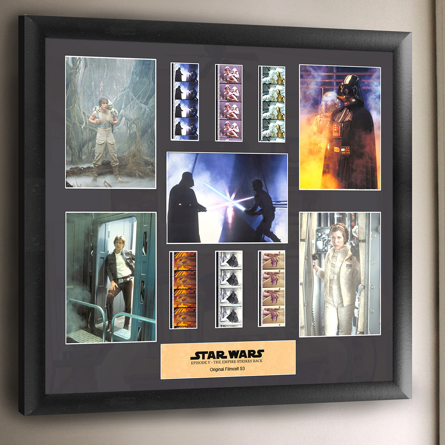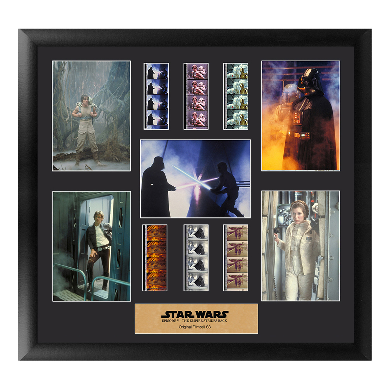 Bring a piece of the Star Wars saga to your home collection with this FilmCells™ Montage. Each one of these stunningly cinematic presentations is made with careful attention to detail. Double matted, and placed in a quality frame, this piece contains an acrylic front and back that allows natural light to enhance the individual film frames. Each piece of film is hand-cut to provide you with the best possible scenes, ensuring that each set is unique and varied. This framed collectible features official artwork from Star Wars Episode V: Empire Strikes Back, a certificate of authenticity, and six strips of real 35mm film from the movie. This special edition features a customized backlit LED acrylic frame with a 30,000-hour LED lamp life for an even more spectacular presentation.