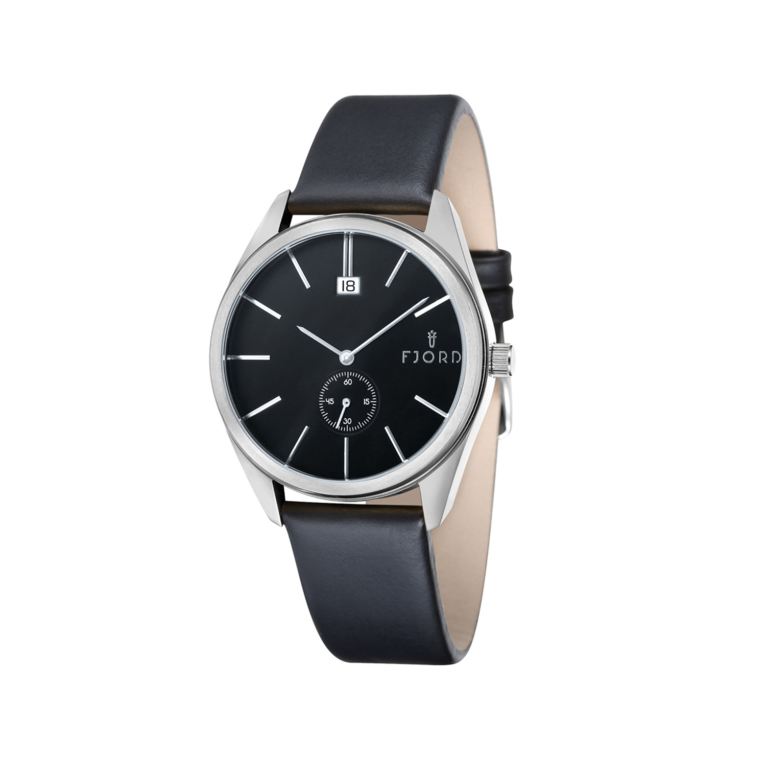 The Ursa watch is dedicated to the quiet power of Nordic landscapes. The sleek touches include a tidy watch face with a date display, a second subdial, and polished stainless steel case. A full-grain black leather strap completes the clean-cut look.
