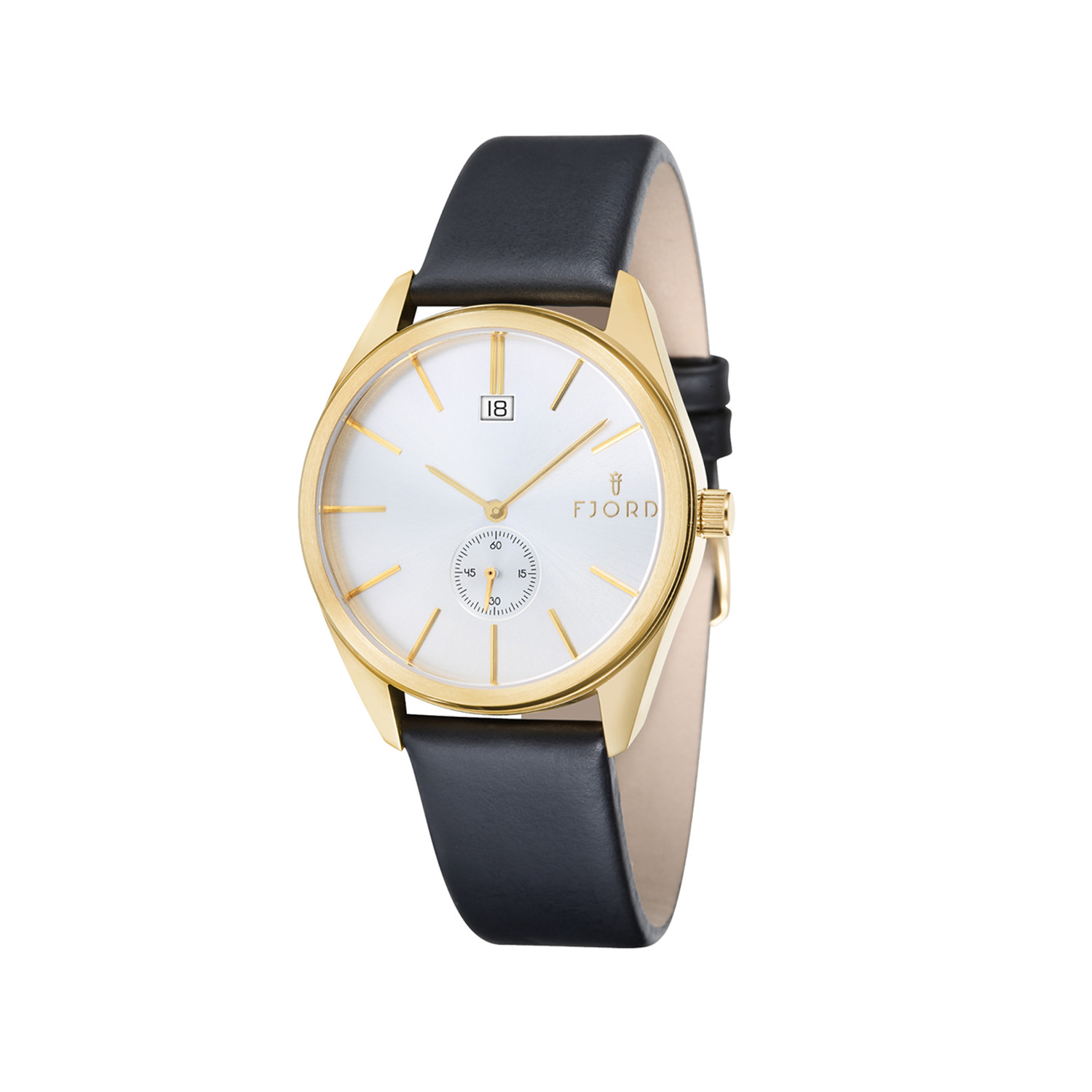 The Ursa watch is dedicated to the quiet power of Nordic landscapes. The sleek touches include a tidy watch face with a date display, a second subdial, and polished stainless steel case. A full-grain black leather strap completes the clean-cut look.