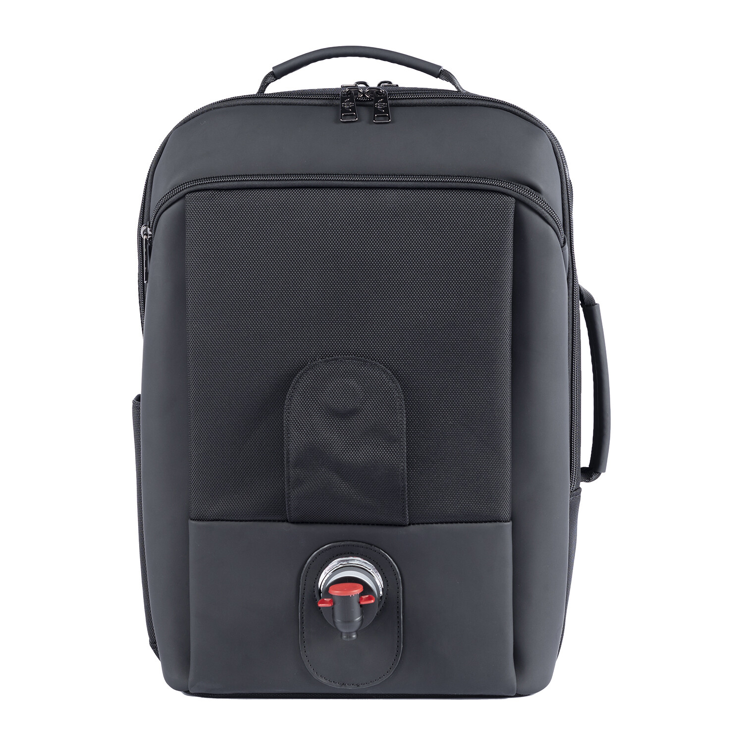 VinXplorer is a must-have unique travel solution for the outdoor lifestyle enthusiast, whether for hiking, biking, boating, road travel, or just having a party on the go with your favorite wine, beer, spirits, or other beverage of choice. This flexible design features a removable 2-bottle hard shell case insert and a disposable 1.5-liter bladder with nozzle for storing and dispensing beverages from inside a waterproof compartment. Separate compartments store laptops, devices, and other personal effects. The padded adjustable ergonomic shoulder straps can be tucked away inside so that the side backpack handle can allow the user to carry on board airlines without liquids like regular luggage.