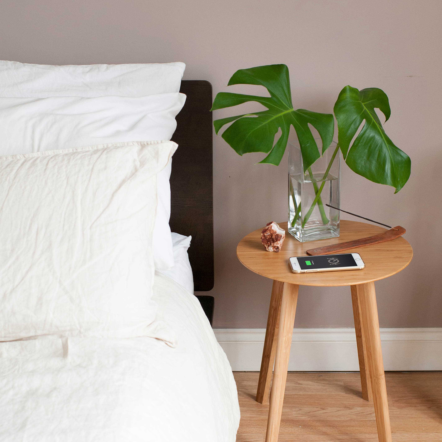 The FurniQi Side Table makes it easy to just drop your device and charge. The discreet laser engraved charging spot offers a sleek and subtle way to keep your devices topped off with ease. The solid bamboo construction also makes this a striking side table that matches any aesthetic.