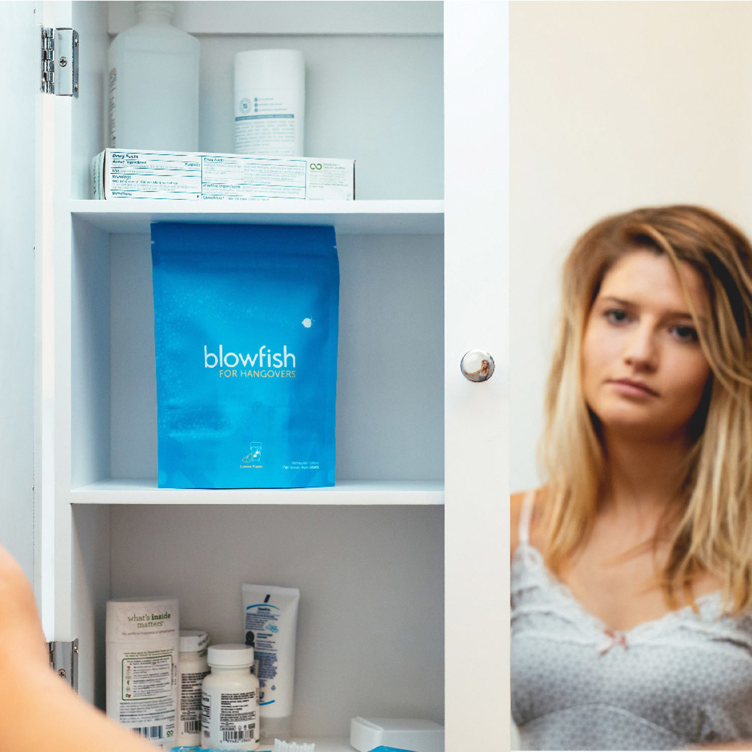 There are a lot of so-called hangover remedies floating around these days, but only Blowfish has a formulation recognized as effective by the FDA. When you hit that horrible morning after, just drop two Blowfish tablets in water and drink it when the fizzing stops. You’ll feel better in about 15 minutes or your money back.