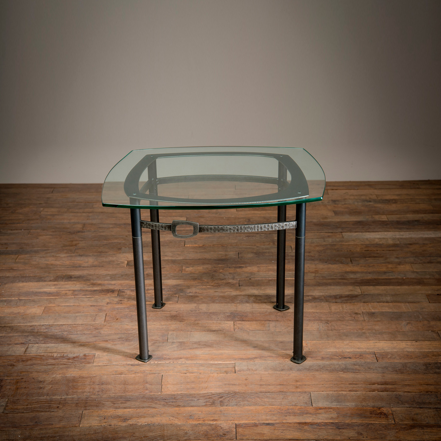 Repeating retro curves define this 1950s-inspired side table created in collaboration with designer Julie Henry. Each table is composed of hand-forged and hammer-textured wrought iron frames coated with a clear polyurethane finish, and a 3/8″ thick clear glass top a with rounded polished edge.