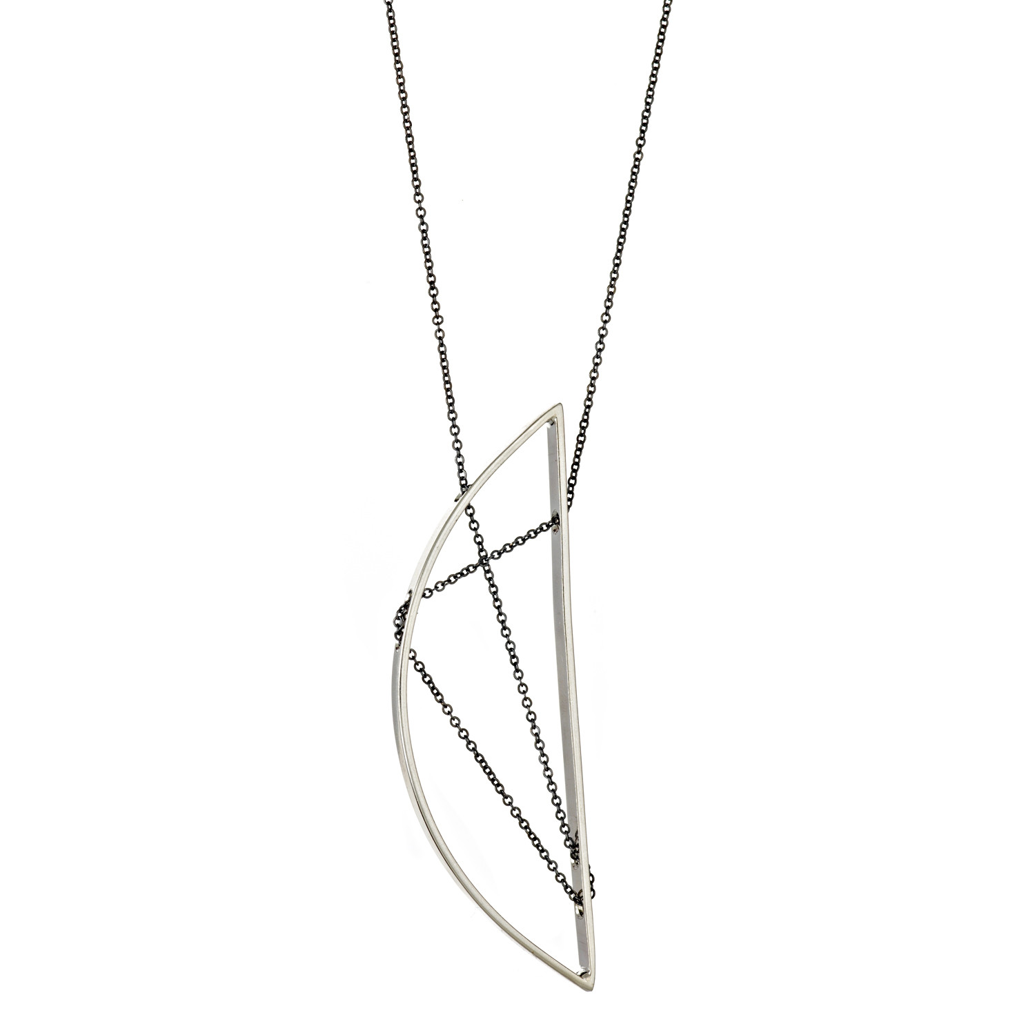 This ultra modern necklace consists of a fine sterling silver chain that glides gracefully through the precisely drilled holes of a moon-shaped piece, forming a pattern that is fixed and fluid all at once. Timeless, yet fresh in appearance, the Demi Selene guarantees absolute class in both the workplace and the night club.