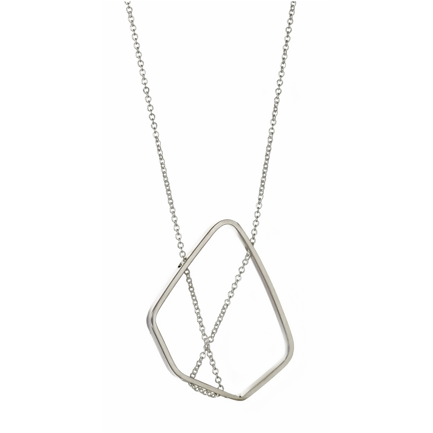 This ultra modern necklace consists of a fine sterling silver chain that glides gracefully through the precisely drilled holes of a unique geometric shape, forming a pattern that is fixed and fluid all at once. Timeless, yet fresh in appearance, the 101 guarantees absolute class in both the workplace and the night club.