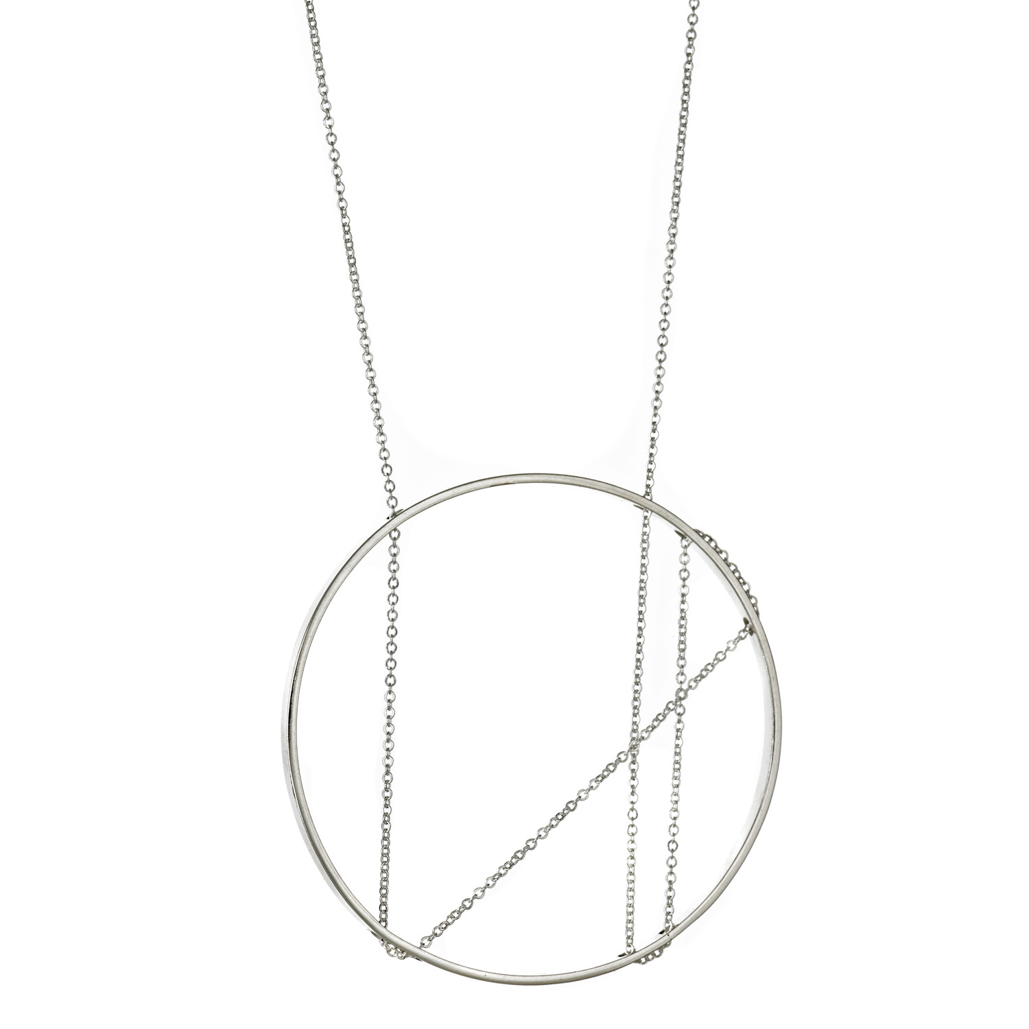 This ultra modern necklace consists of a fine sterling silver chain that glides gracefully through the precisely drilled holes of a perfect circle, forming a beautifully chaotic pattern that is fixed and fluid all at once. Timeless, yet fresh in appearance, the 104 guarantees absolute class in both the workplace and the night club.
