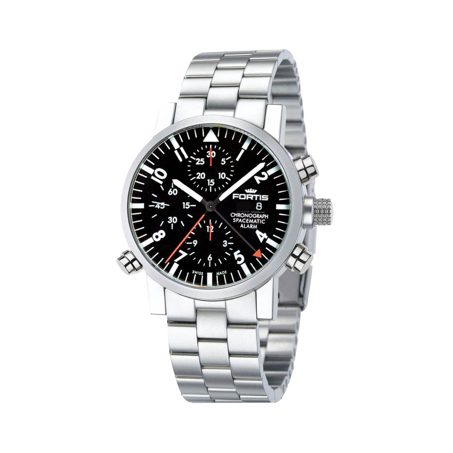 This unique timepiece features Fortis' famous automatic chronograph with a mechanical alarm. Specialities include two spring barrels to ensure the separate power reserve of both the watch movement and the alarm, a sound spring in the shape of a tuning fork, an alarm hammer and a special rotor with blue star engravings. The best in materials and developments has led to this timeless statement of style and taste.