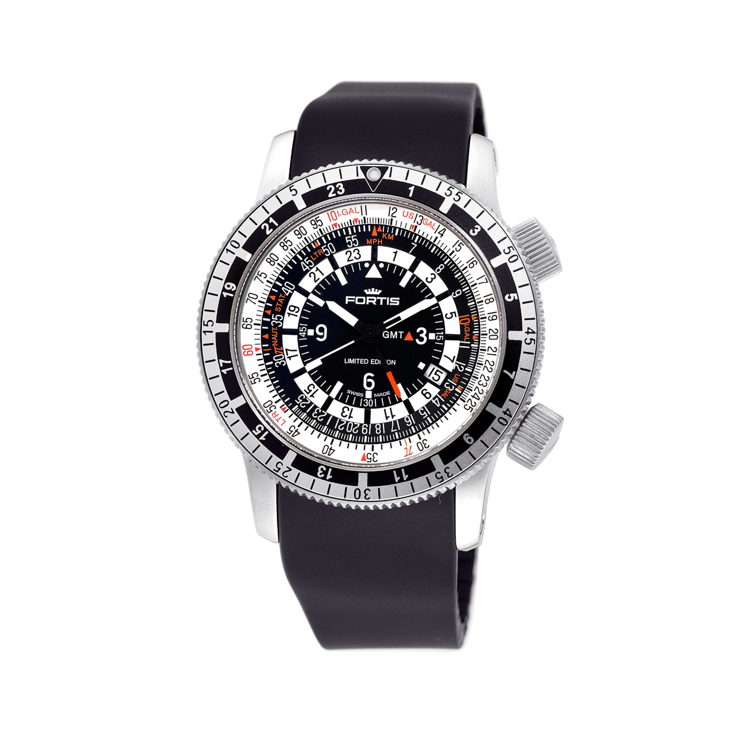 A cult watch with a diameter of 47 mm, the B-47 Calculator was developed to pilots’ specifications to fulfill the need for all typical flight parameters. Comfortable and highly exact, this watch features Swiss micro-mechanics in perfect symbiosis with the classical slide-rule function and exceptionally good legibility. This modern classic offers 3 time zones, a countdown function and country specific conversion scales. The case back reveals a temperature scale in Celsius and Fahrenheit as well as the individual watch identity number.