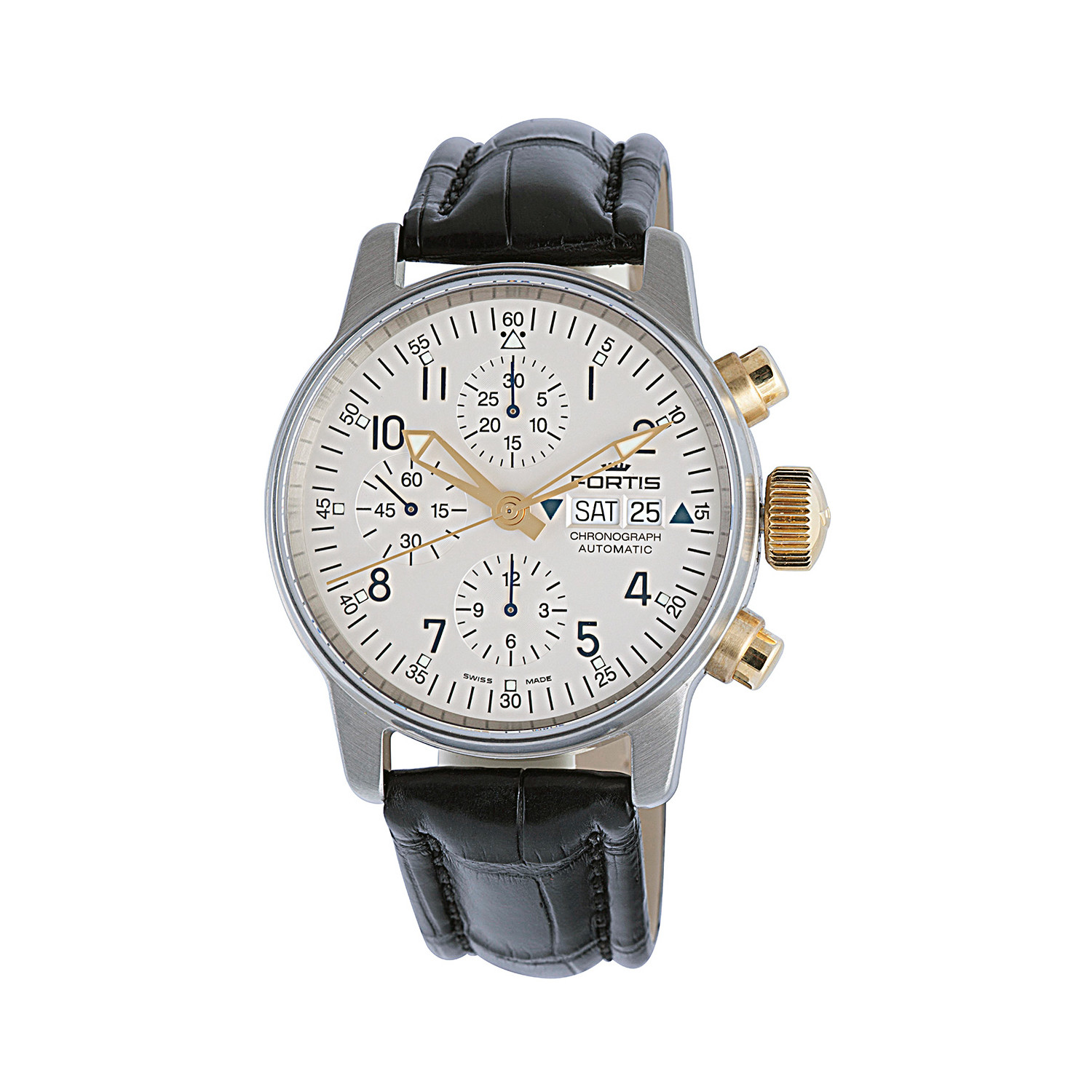 This unique timepiece features Fortis' famous automatic chronograph with a mechanical alarm. Specialities include two spring barrels to ensure the separate power reserve of both the watch movement and the alarm, a sound spring in the shape of a tuning fork, an alarm hammer and a special rotor with blue star engravings. The best in materials and developments has led to this timeless statement of style and taste.