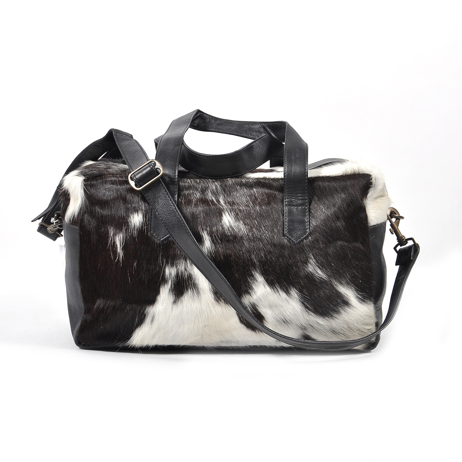 Even the most spontaneous travelers need the perfect duffle bag and it has arrived. This chic, cowhide bag is ready to jet at a moment's notice with a unique natural exterior, supple cotton lining, two inside pockets, one zippered pocket and a removable shoulder strap. Pack your bag and take to the road with this rugged style.