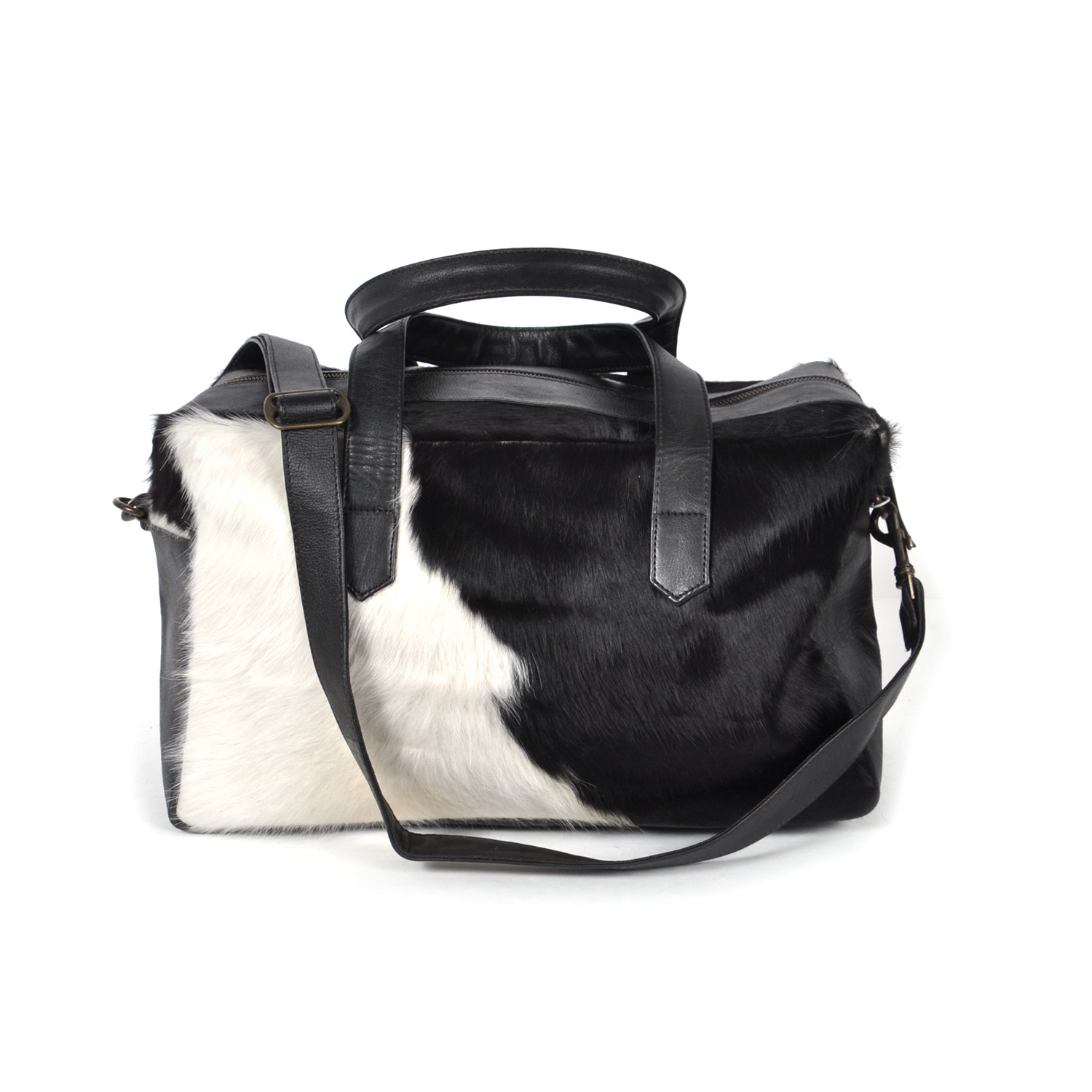 Even the most spontaneous travelers need the perfect duffle bag and it has arrived. This chic, cowhide bag is ready to jet at a moment's notice with a unique natural exterior, supple cotton lining, two inside pockets, one zippered pocket and a removable shoulder strap. Pack your bag and take to the road with this rugged style.