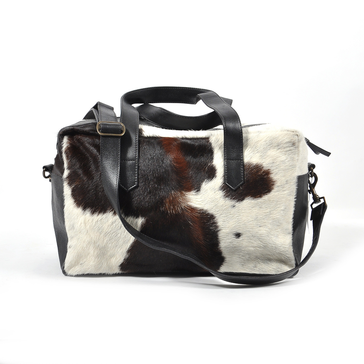 Even the most spontaneous travelers need the perfect duffle bag and it has arrived. This chic, cowhide bag is ready to jet at a moment's notice with a unique natural exterior, supple cotton lining, two inside pockets, one zippered pocket and a removable shoulder strap. Pack your bag and take to the road with this rugged style.