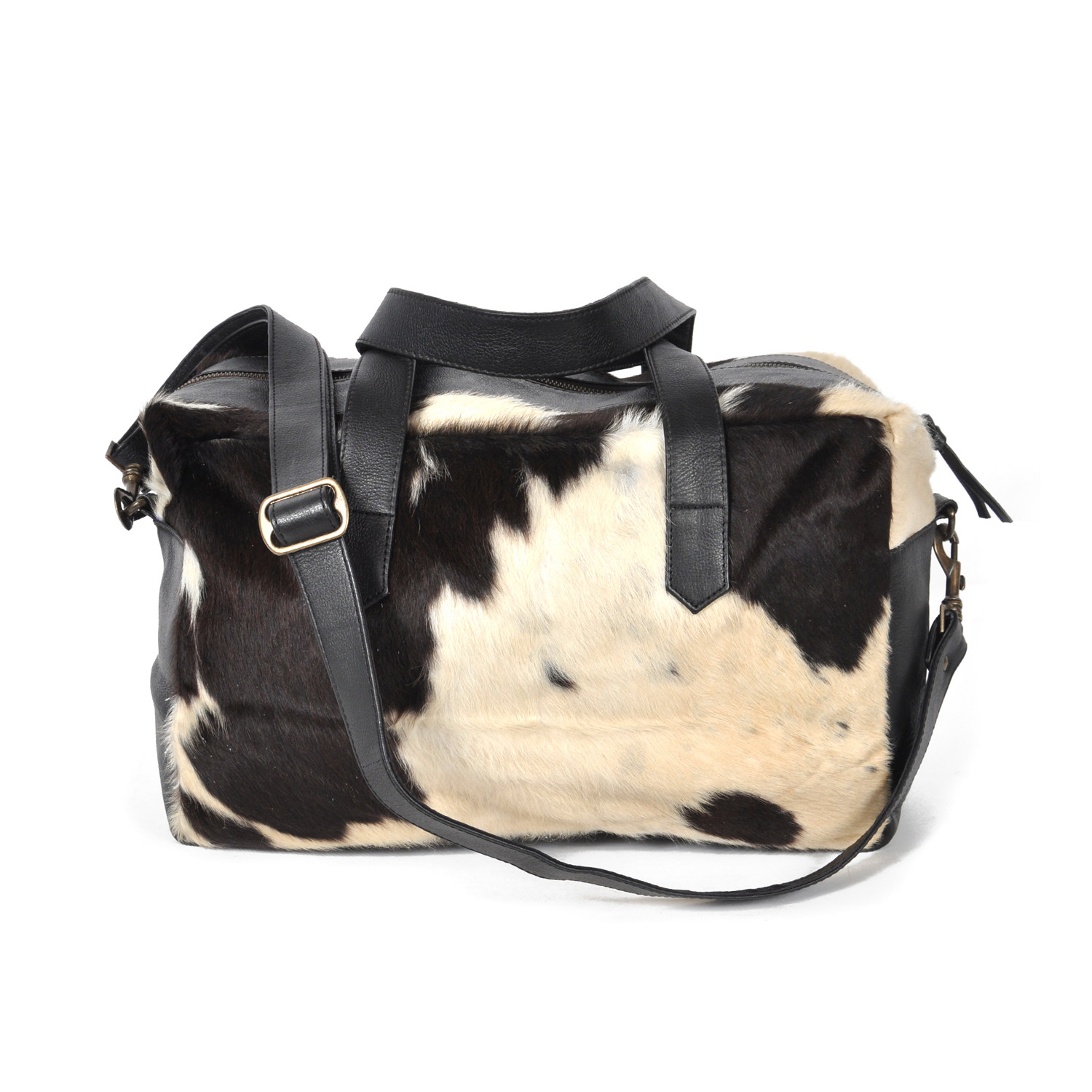 Even the most spontaneous travelers need the perfect duffle bag and it has arrived. This chic, cowhide bag is ready to jet at a moment's notice with a unique natural exterior, supple cotton lining, two inside pockets, one zippered pocket and a removable shoulder strap. Pack your bag and take to the road with this rugged style.