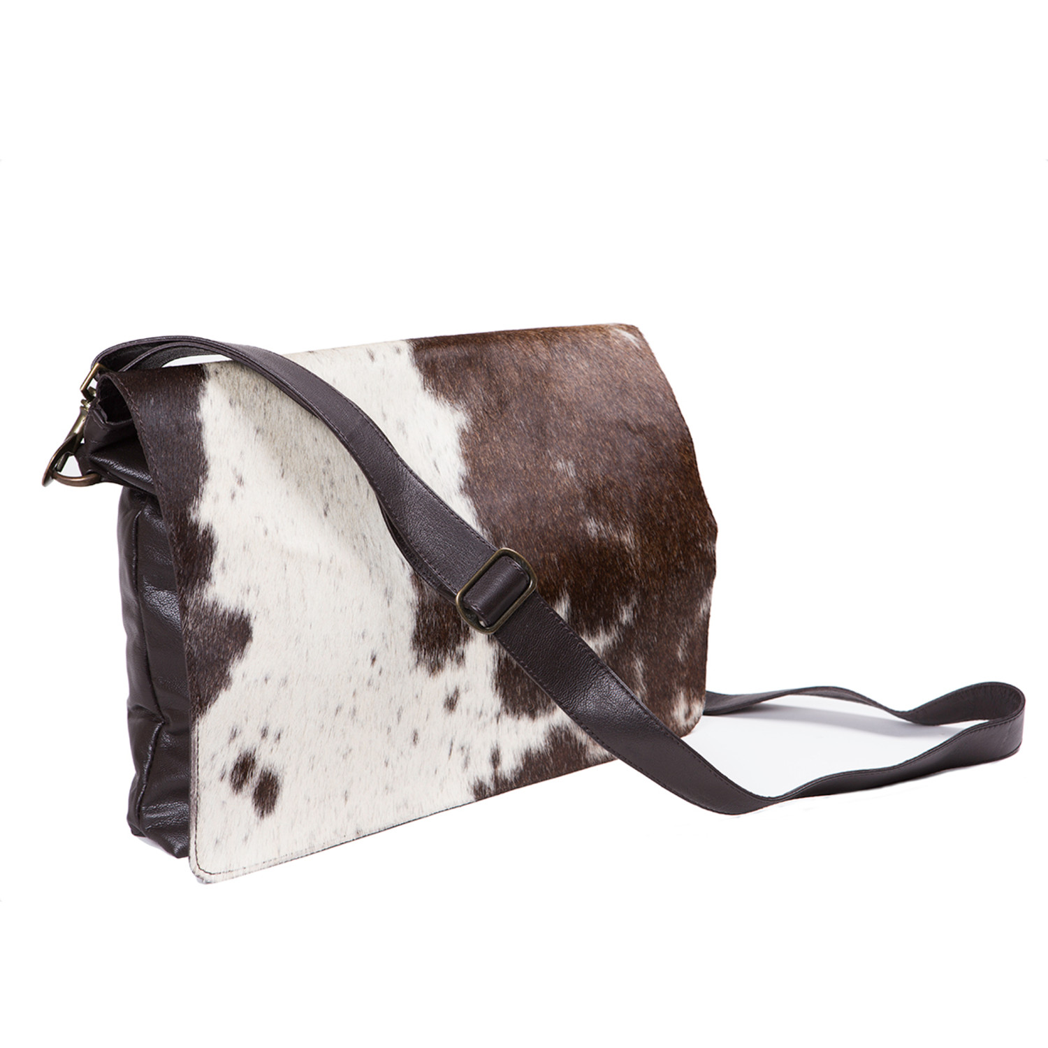 This Cowhide Leather Messenger Bag is great for everyday use. Just stick your laptop inside and set out to make a statement with this utterly unique bag from Found Object. This messenger bag comes from natural cow leather, with a shoulder strap that features brass hardware perfectly in keeping with its rugged look.