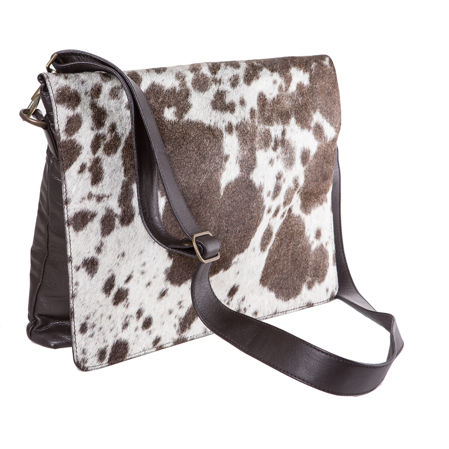 This Cowhide Leather Messenger Bag is great for everyday use. Just stick your laptop inside and set out to make a statement with this utterly unique bag from Found Object. This messenger bag comes from natural cow leather, with a shoulder strap that features brass hardware perfectly in keeping with its rugged look.