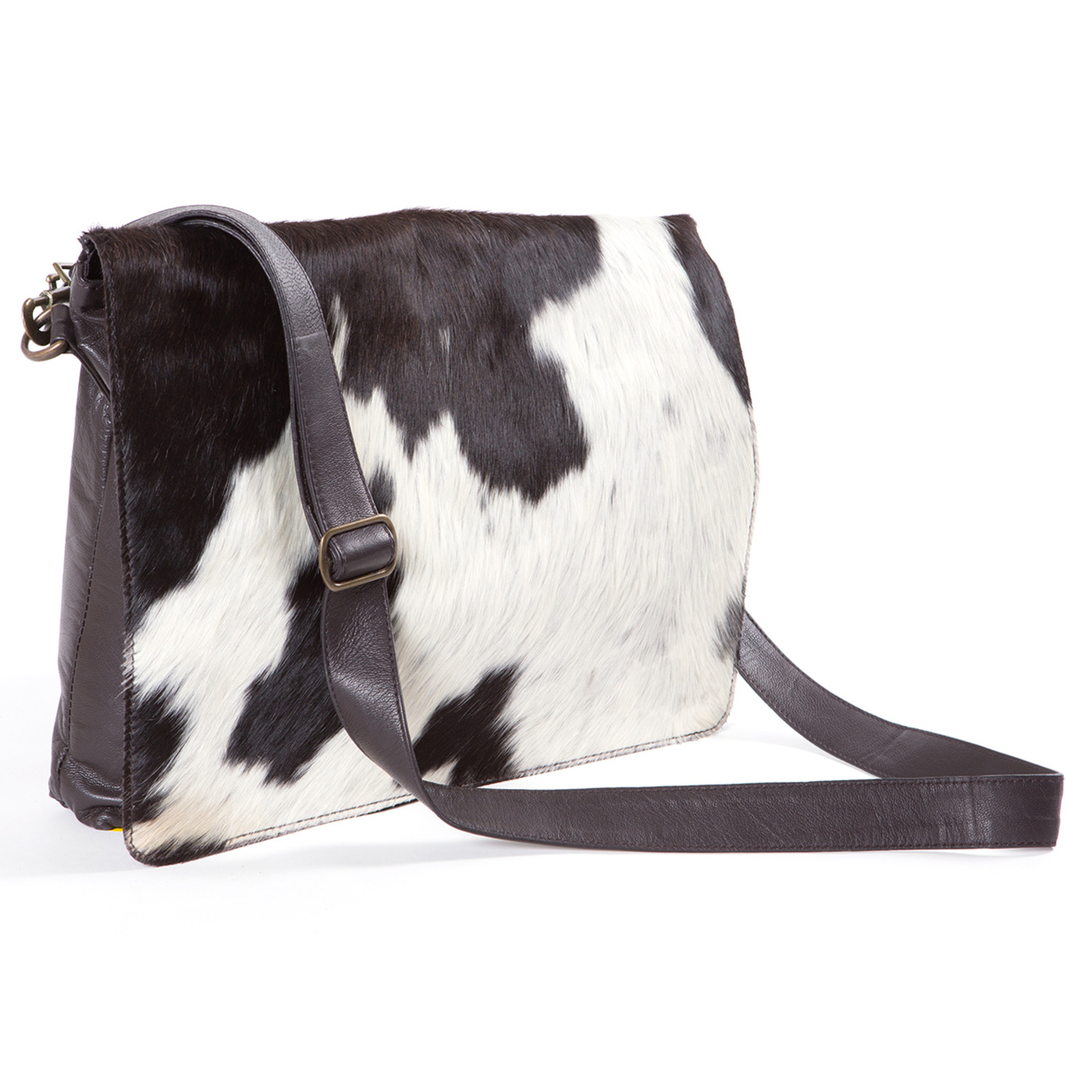 This Cowhide Leather Messenger Bag is great for everyday use. Just stick your laptop inside and set out to make a statement with this utterly unique bag from Found Object. This messenger bag comes from natural cow leather, with a shoulder strap that features brass hardware perfectly in keeping with its rugged look.