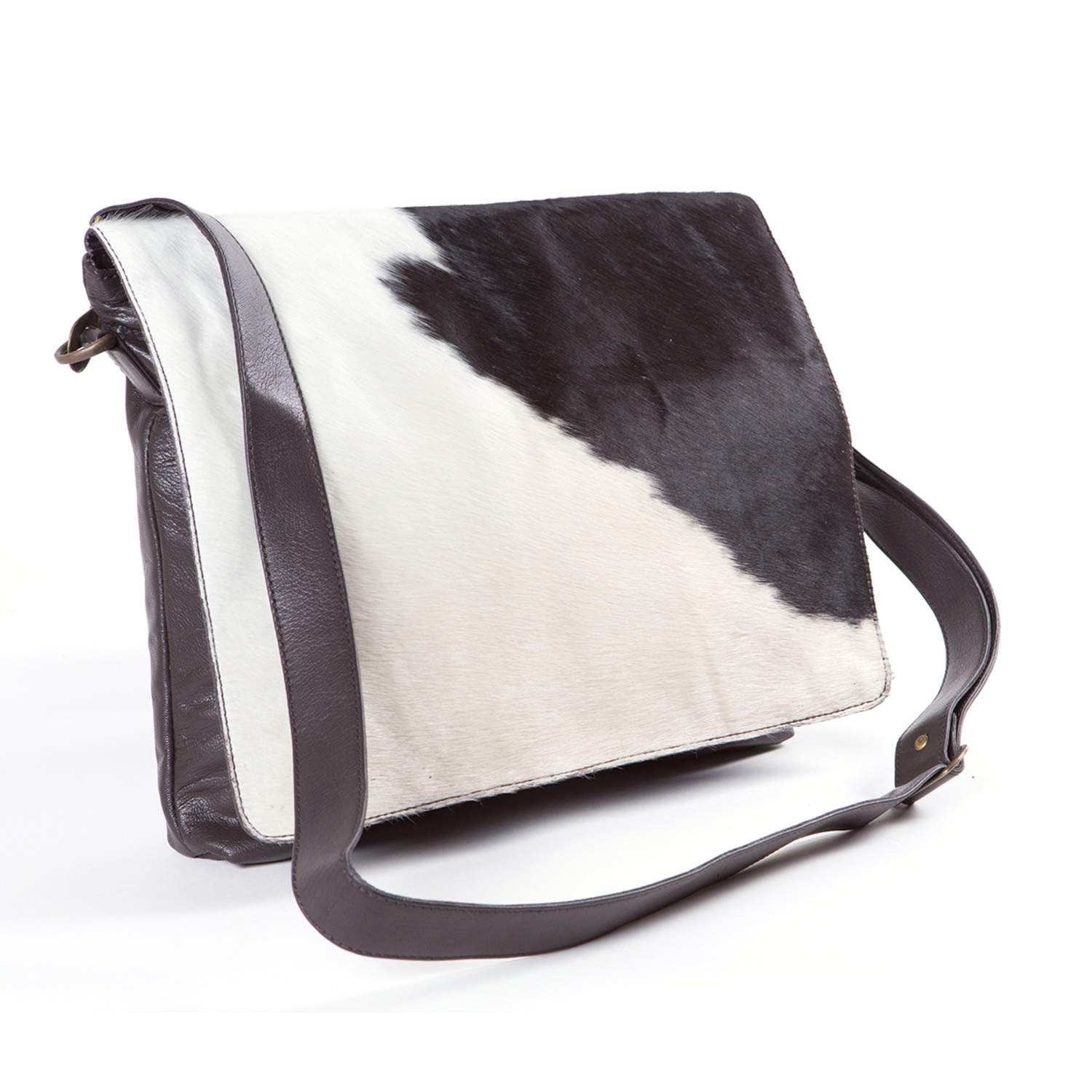 This Cowhide Leather Messenger Bag is great for everyday use. Just stick your laptop inside and set out to make a statement with this utterly unique bag from Found Object. This messenger bag comes from natural cow leather, with a shoulder strap that features brass hardware perfectly in keeping with its rugged look.