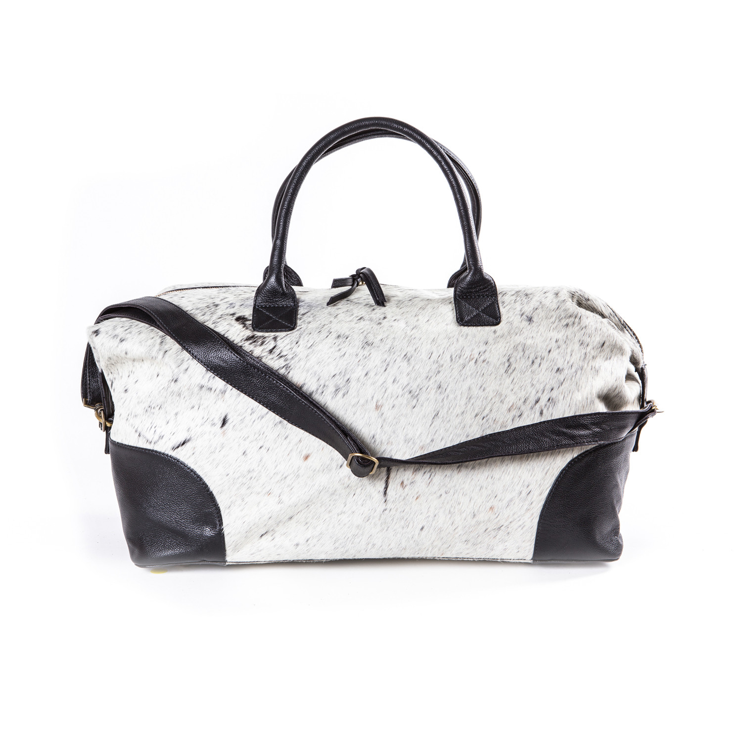 Even the most spontaneous travelers need the perfect weekender and it has arrived. This chic cowhide leather bag is ready to jet at a moment's notice with a unique natural exterior that's one of a kind. It's built to last, with supple cotton lining, two inside pockets, one zippered pocket and a removable shoulder strap. Pack your bag and take to the road with this rugged weekender that you won't want to unpack ever again.
