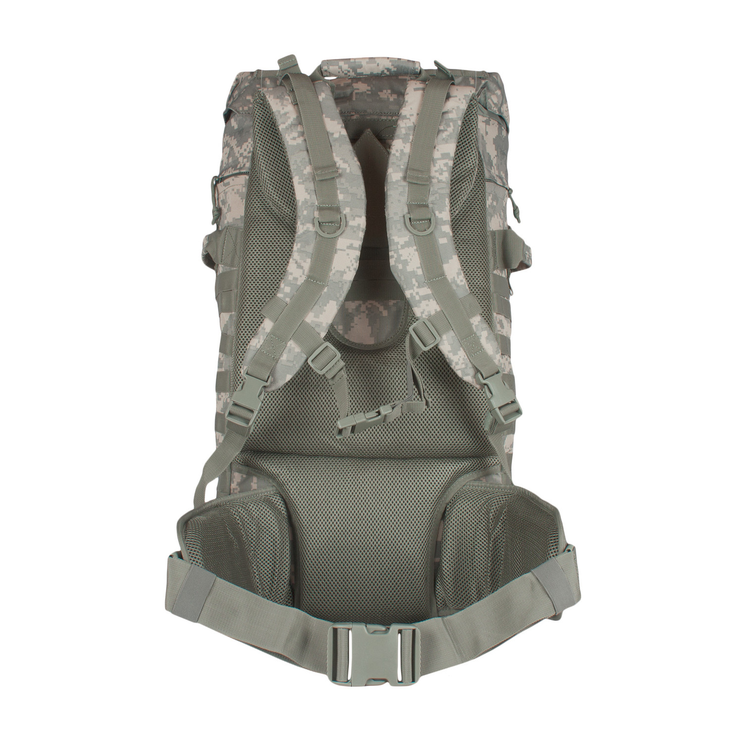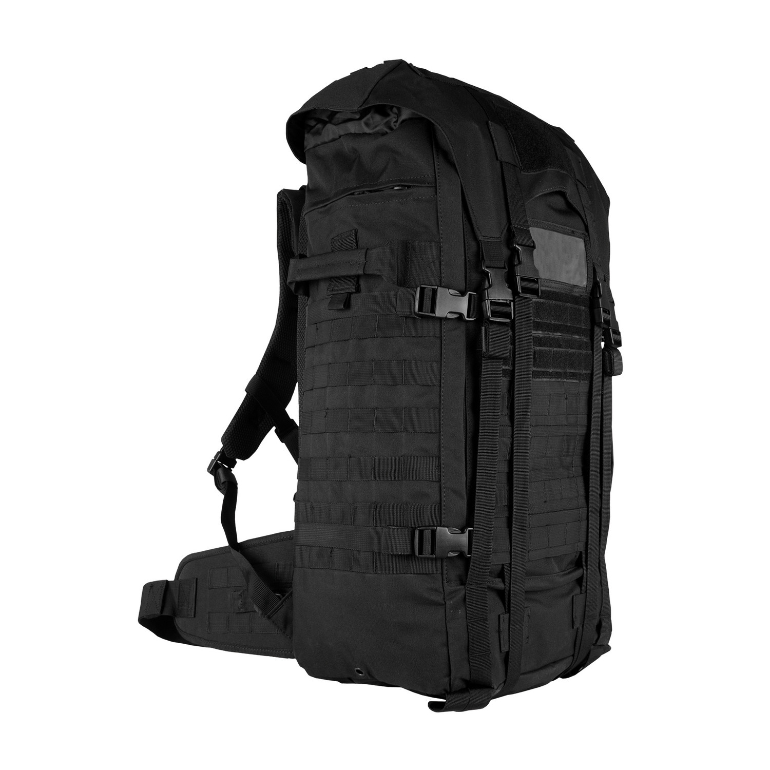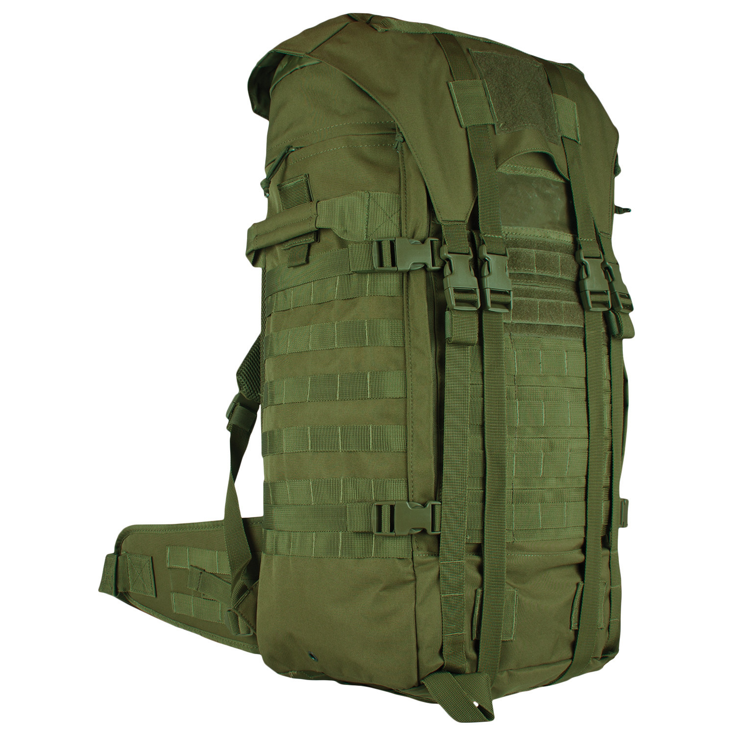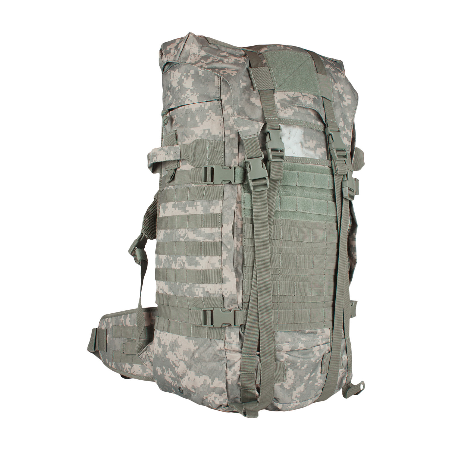 1 Mammoth zippered main compartment with internal cinch straps, 2 large mesh pockets and hydration/computer pocket. Fitted storm flap with internal draw cord closure for added protection. 2 large side-zippered hydration compatible pockets with service ports & loop web strips. Modular web attachment points and "Loop" ID panels. "Ladder" torso adjustable and padded shoulder strap system allows the pack to be adjusted to the users height. Fully Padded: back panel, lumbar support and removable kidney belt. 4 external compression straps and gear straps. Top & side carry handles. ID window. Heavy duty zippers with pull tabs.