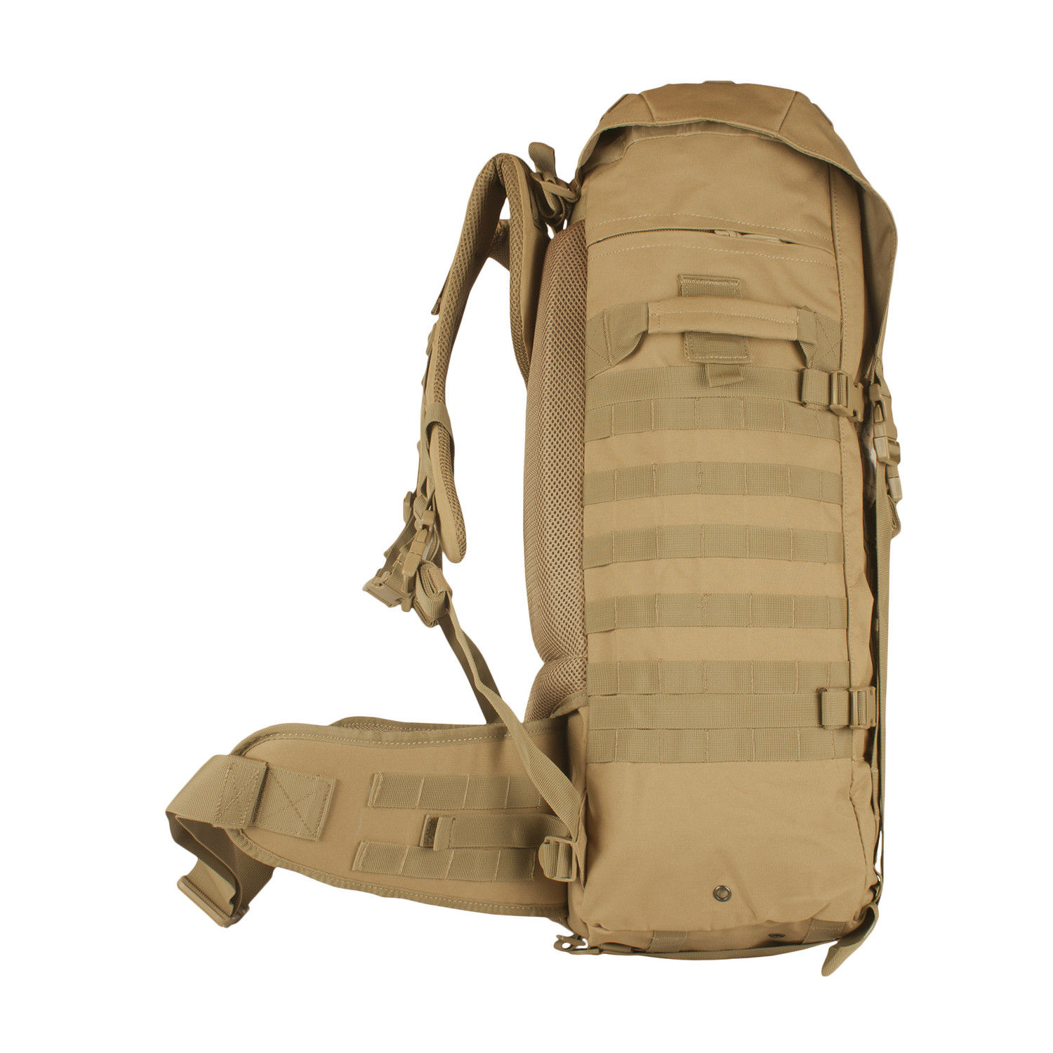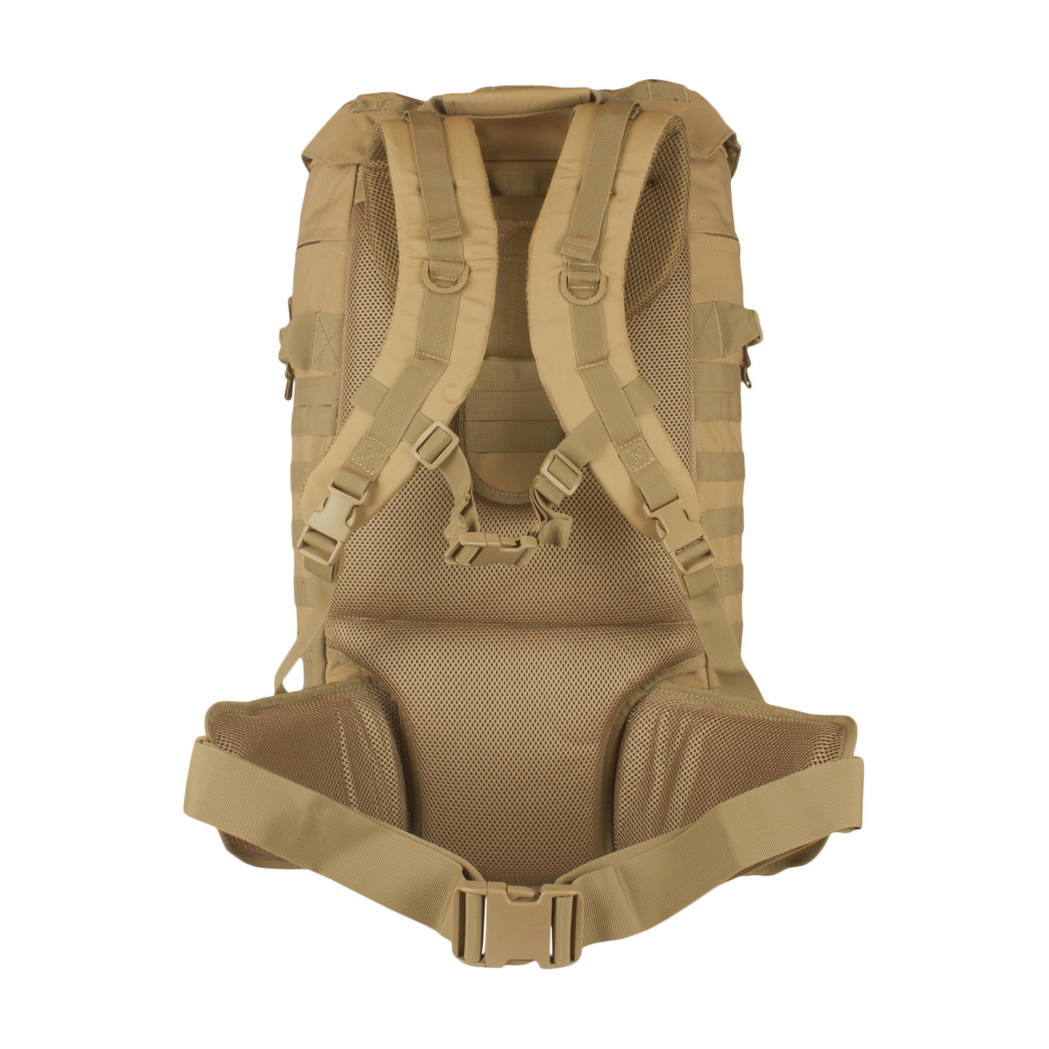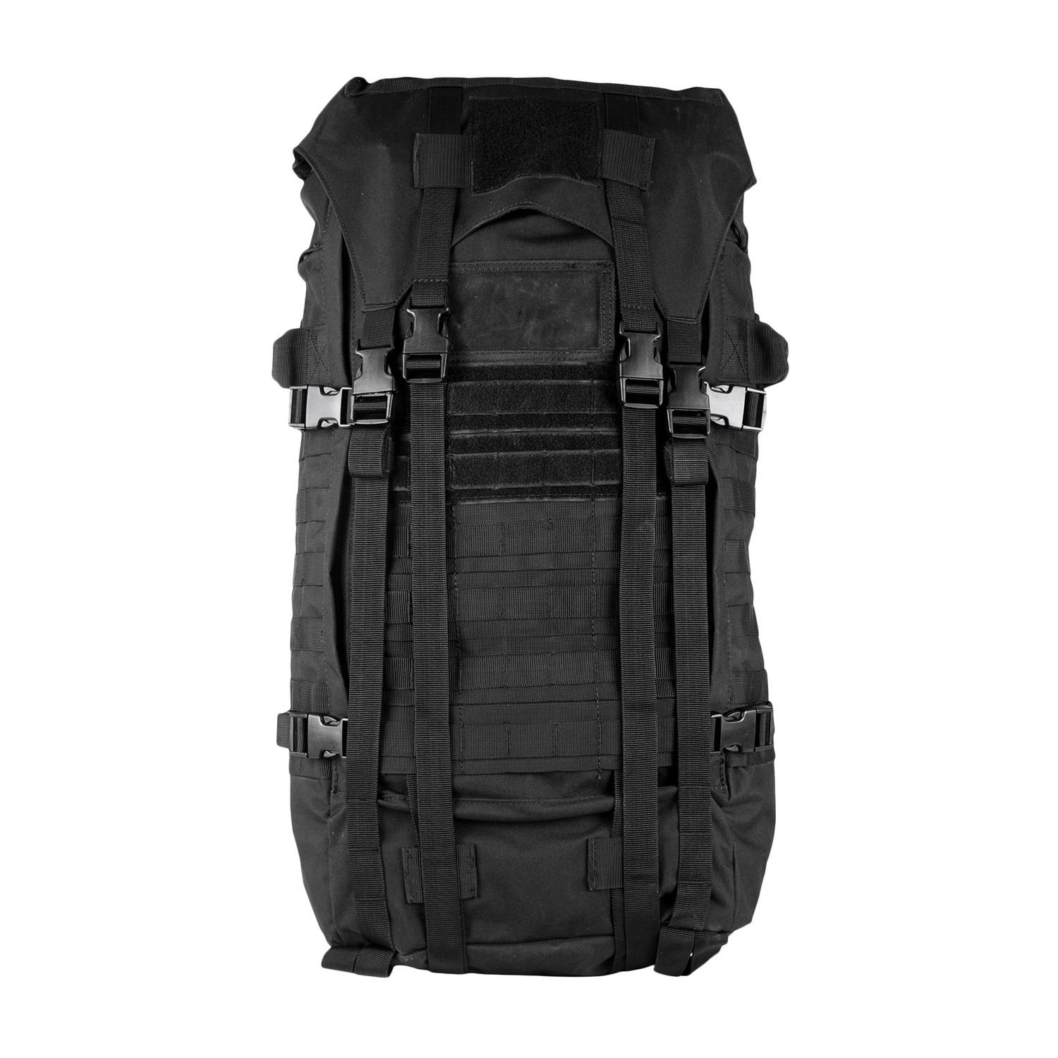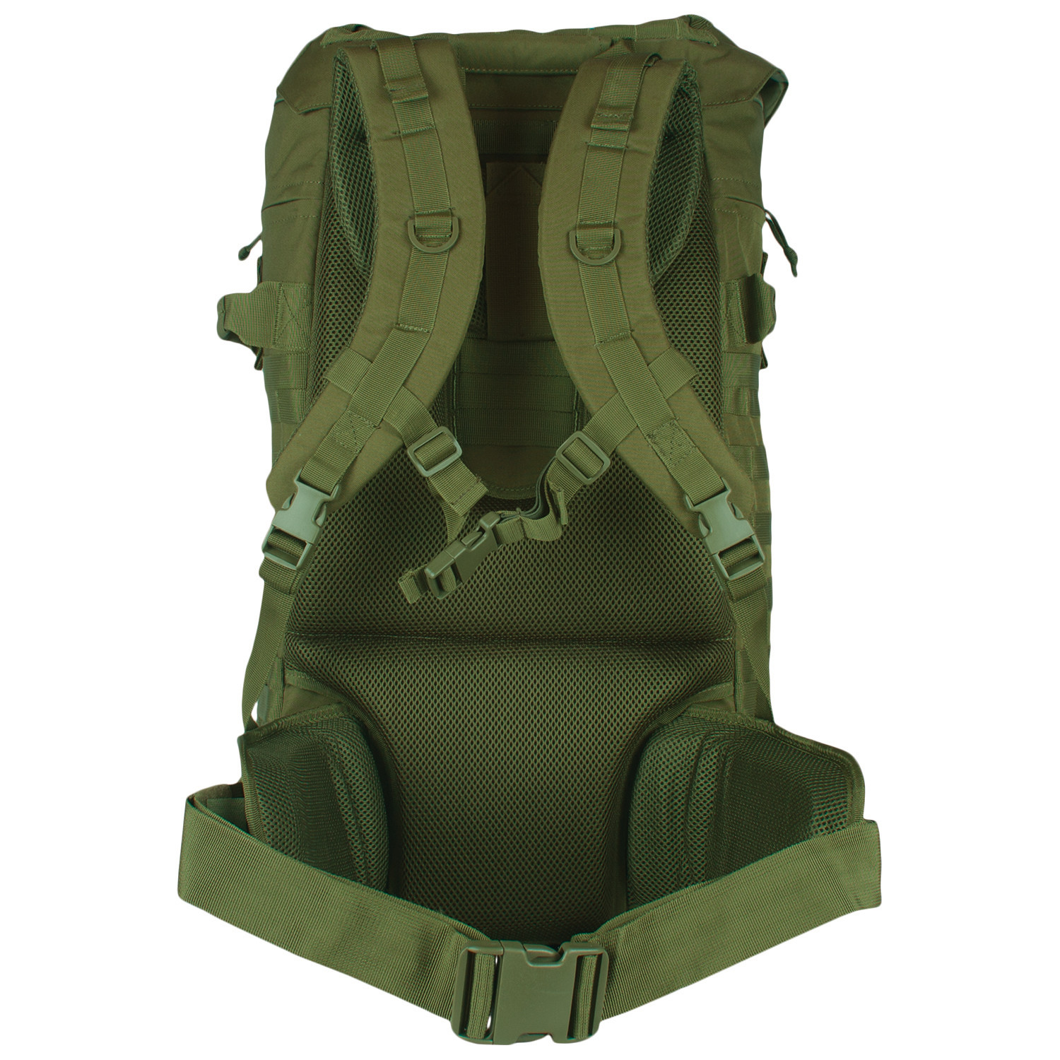 1 Mammoth zippered main compartment with internal cinch straps, 2 large mesh pockets and hydration/computer pocket. Fitted storm flap with internal draw cord closure for added protection. 2 large side-zippered hydration compatible pockets with service ports & loop web strips. Modular web attachment points and "Loop" ID panels. "Ladder" torso adjustable and padded shoulder strap system allows the pack to be adjusted to the users height. Fully Padded: back panel, lumbar support and removable kidney belt. 4 external compression straps and gear straps. Top & side carry handles. ID window. Heavy duty zippers with pull tabs.