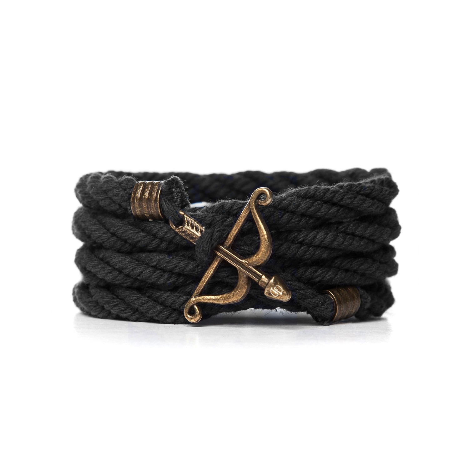 The Venice Nero takes an adventurous style and adds extra depth and character. A triple wraparound cotton cord bracelet, its thick band is adorned with a bow and arrow metal piece.