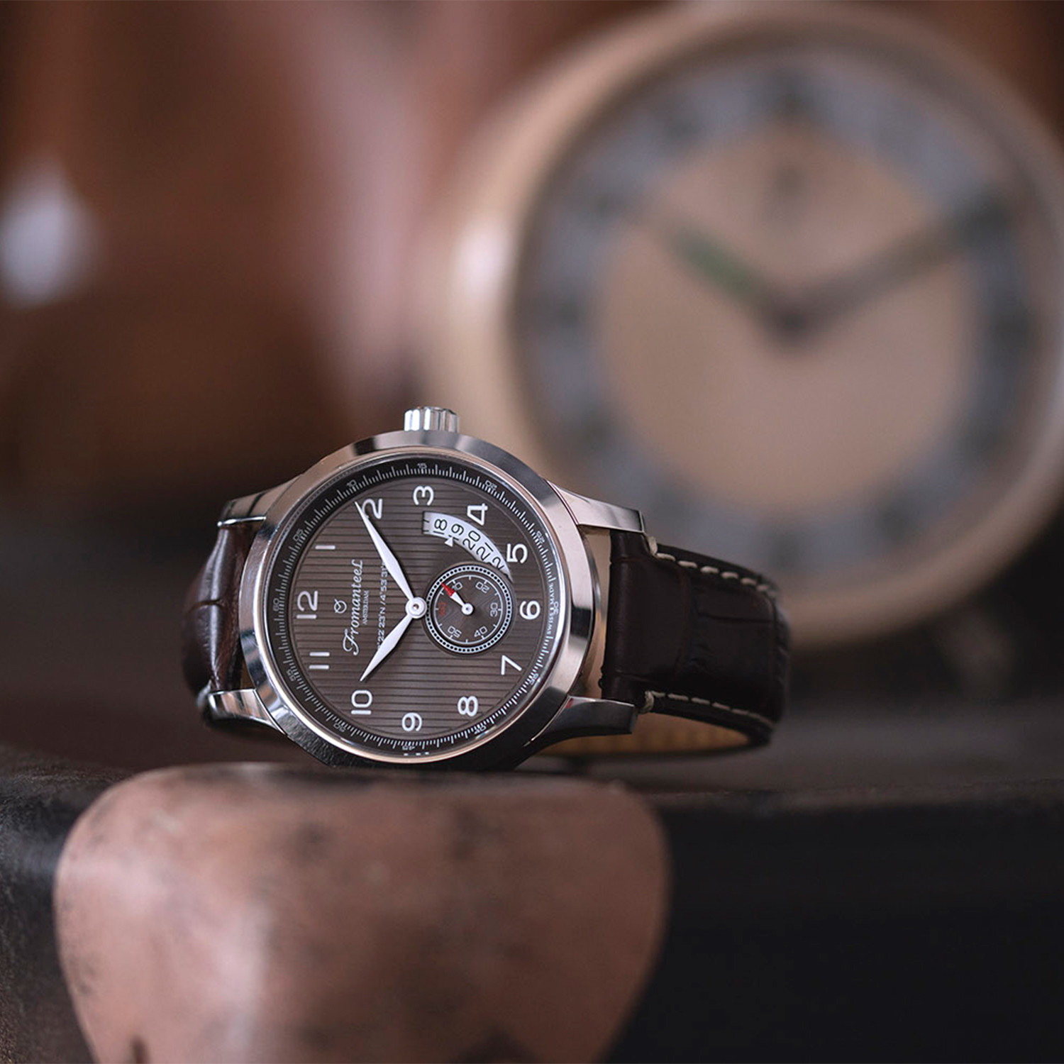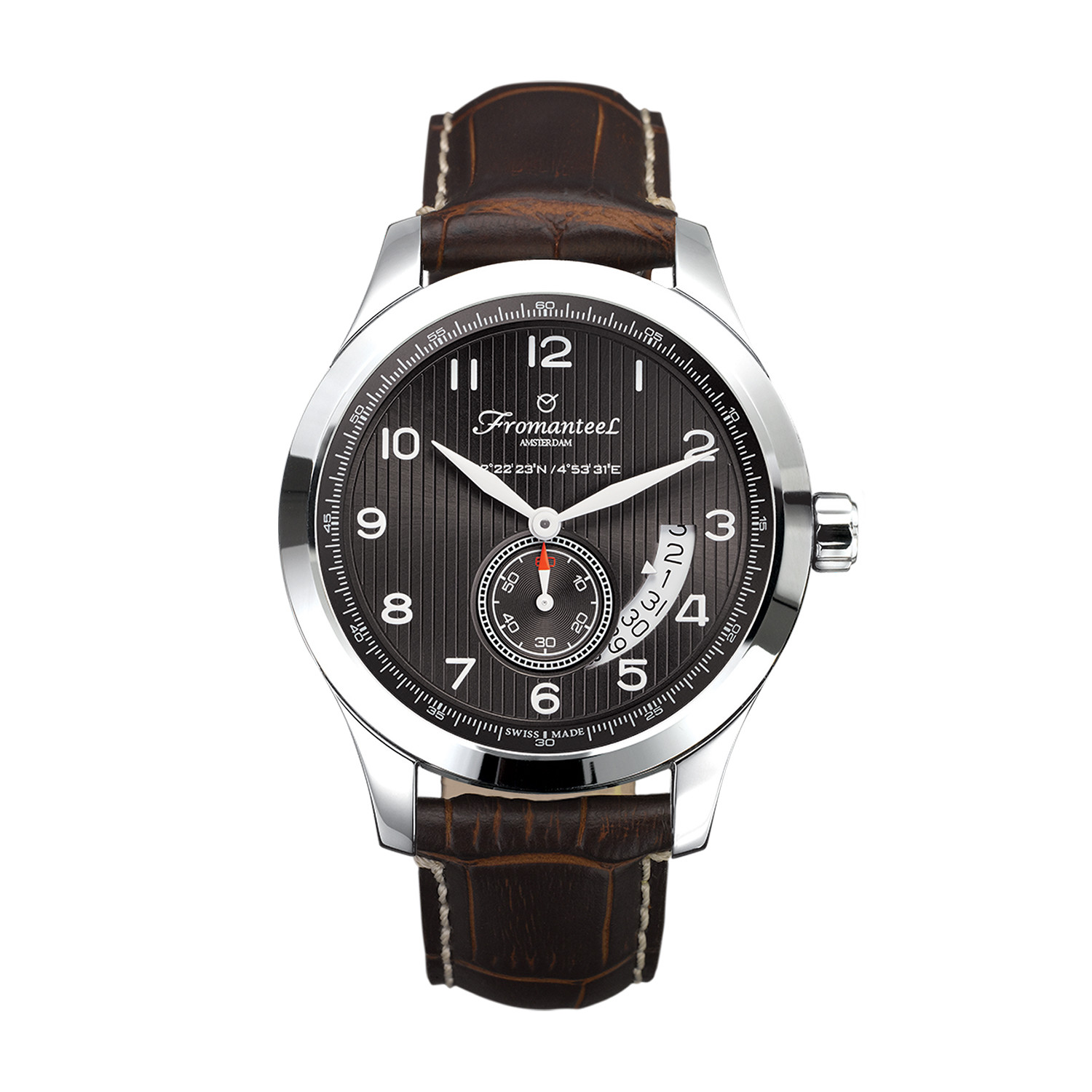 Ahasuerus Fromanteel, a clockmaker in the 17th century, began to manufacture revolutionary clocks equipped with an advanced pendulum mechanism. These clocks earned renown for their accuracy, and Fromanteel expanded his operations to London and Newcastle, creating the world's first multinational clockmakers firm. Now, the Fromanteel name lives on as with these finely crafted watches, featuring Dutch design and Swiss quality.