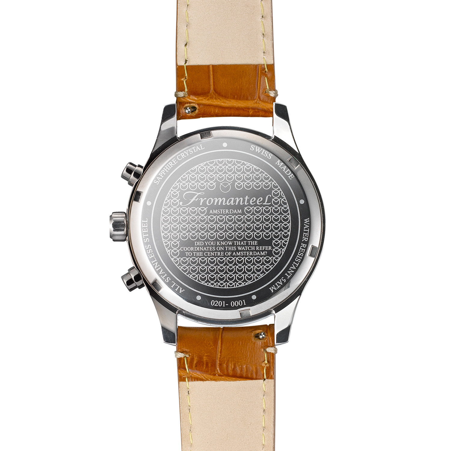 The Amsterdam Chrono resembles the city of Amsterdam. Walking through Amsterdam gives you a high-end and easy-going feeling. This watch is created to give you that same feeling as the city gives you. The watch has a very luxury look to it without being very loud. It’s very humble and that’s what they're known for at Fromanteel.