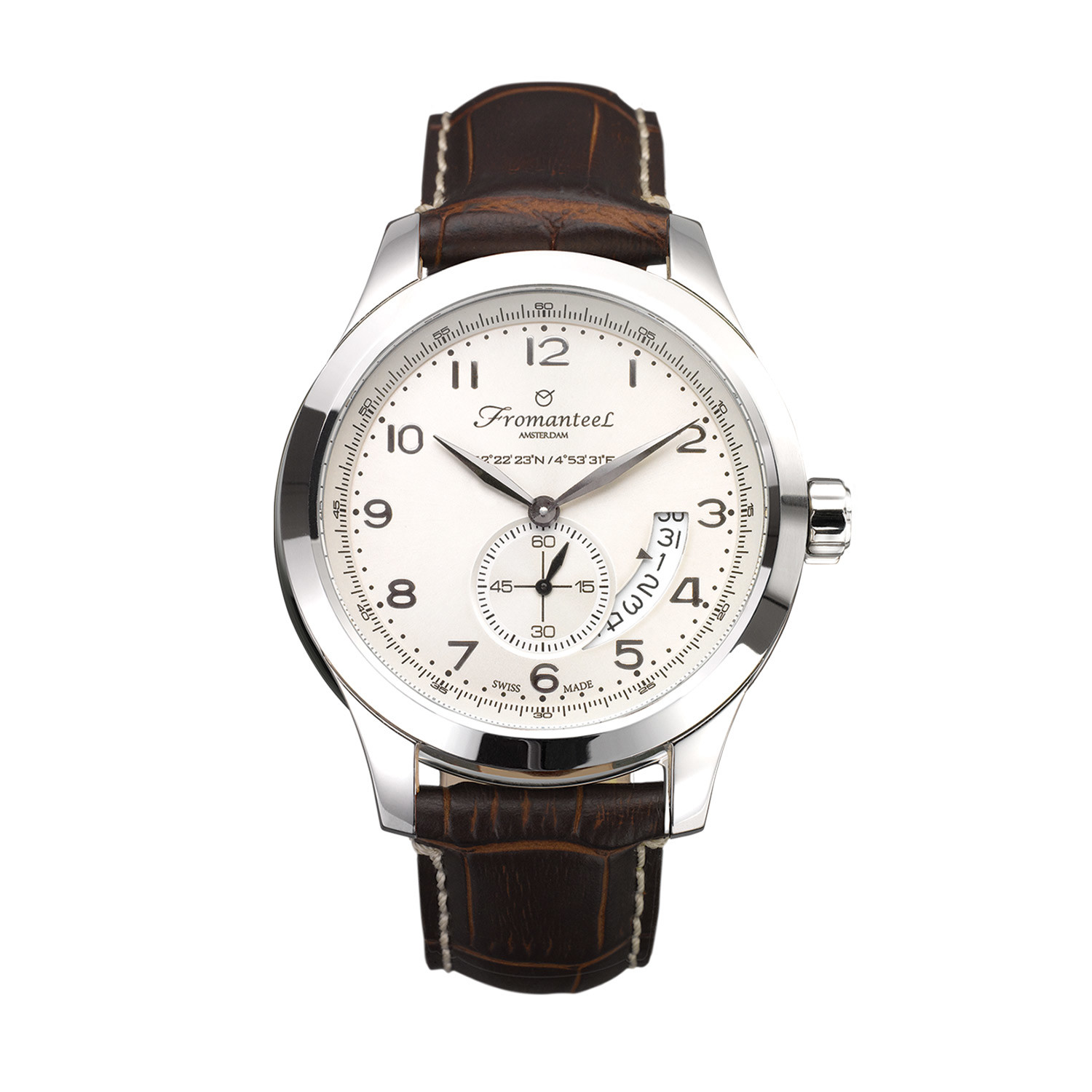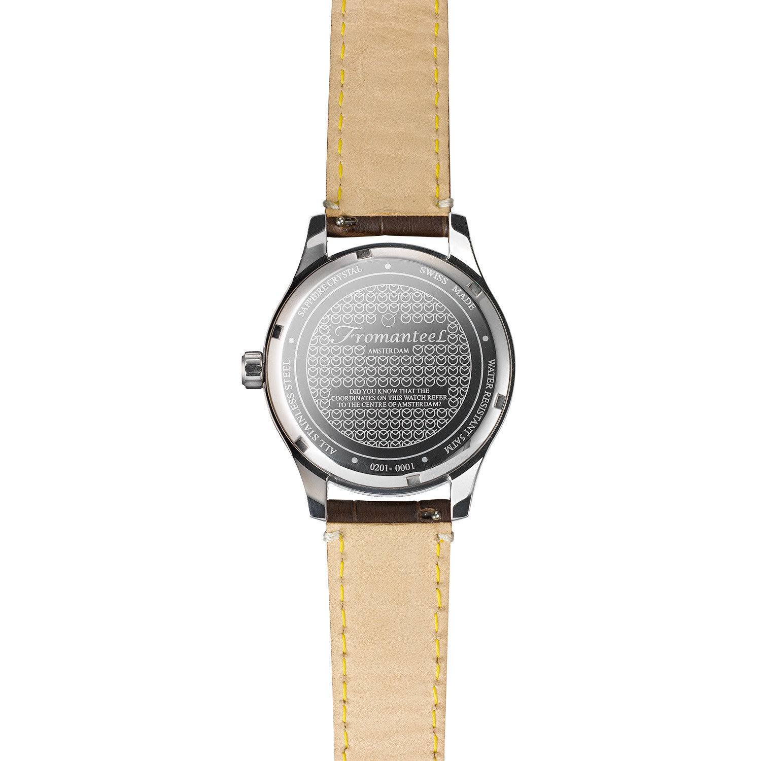 The flagship of the Amsterdam Series has a dial with a bright platinum glaze; giving the Fromanteel Amsterdam Original Quartz a very luxurious look. It is also on the dial where you find the coordinates of the heart of the historical centre of Amsterdam. Its hands and numerals form a pleasant and easily readable contrast with the dial. Features typical to this series are the 'open' date indicator, the miniature second hand and the 'Fromanteel yellow' watch crown.