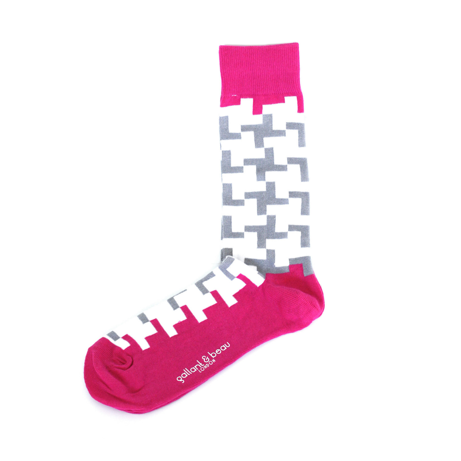 Treat your feet with these luxury socks in fuchsia with a white and grey pattern. Gallant & Beau is made for the man who believes in color, a modern man who can wear his wardrobe with confidence. With a mid-calf height and designer logo, this pair of socks make up essential wardrobe basics that look anything but boring.