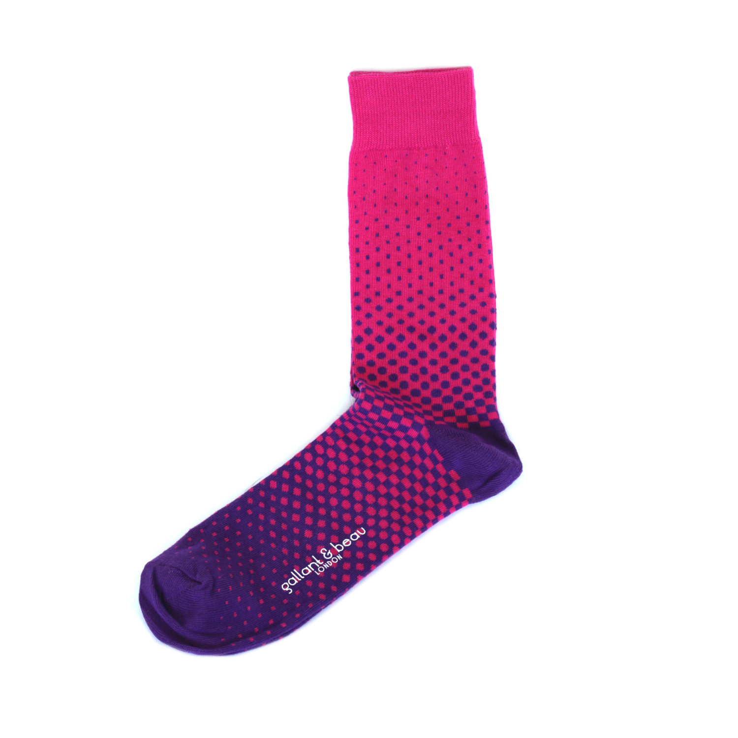 Treat your feet with these luxury socks in fuchsia and purple. Gallant & Beau is made for the man who believes in color, a modern man who can wear his wardrobe with confidence. With a mid-calf height and designer logo, this pair of socks make up essential wardrobe basics that look anything but boring.