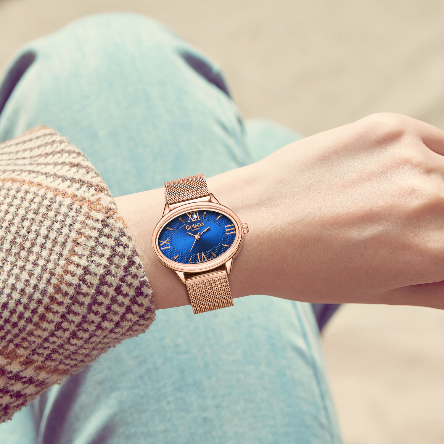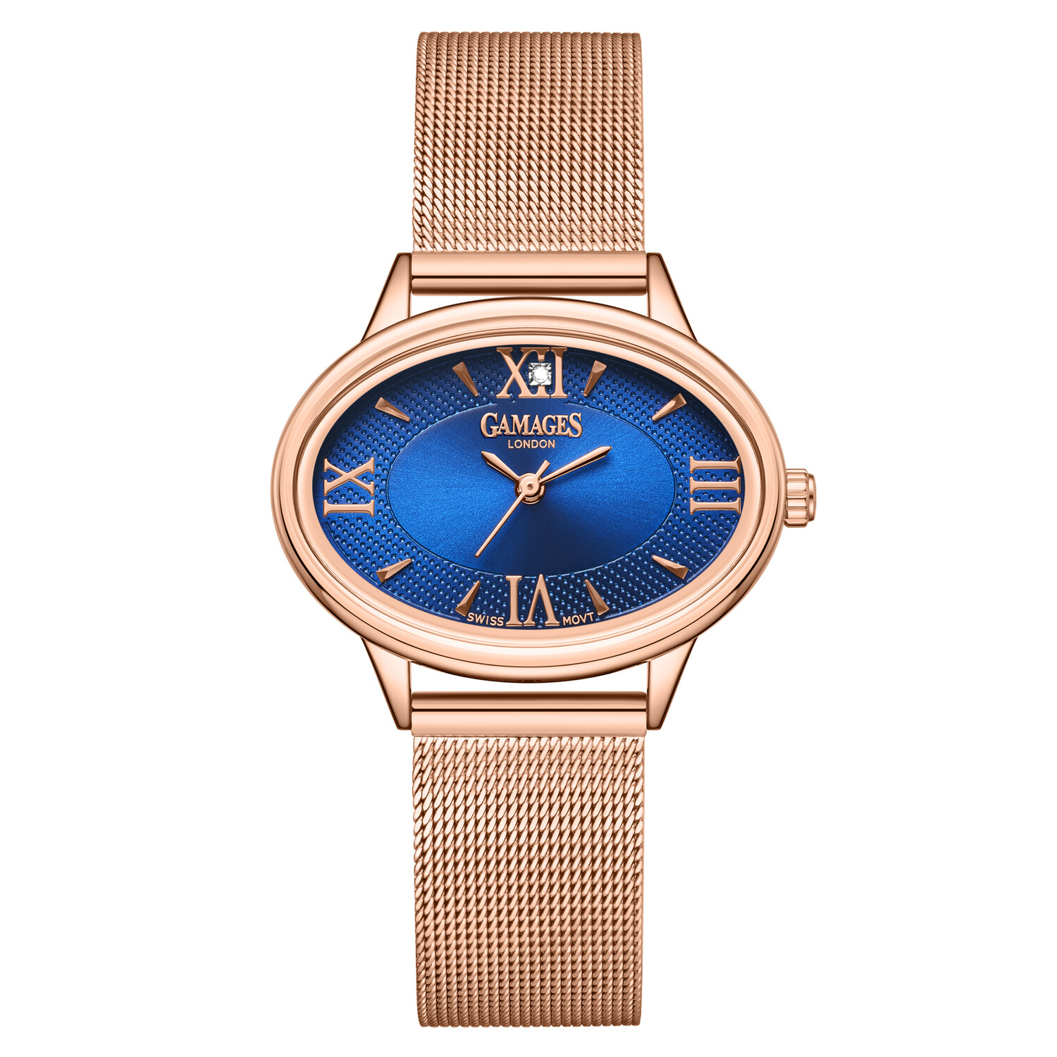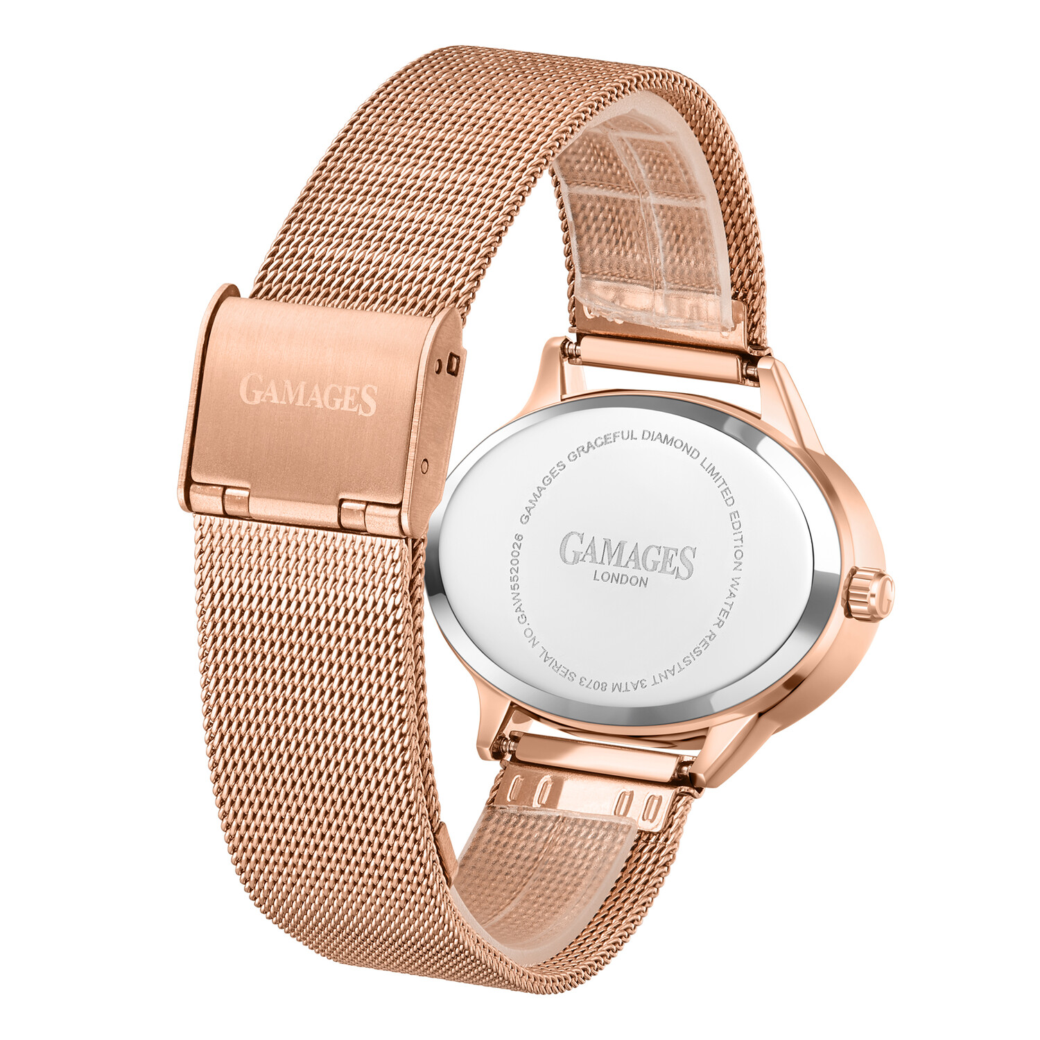 The rose gold Milanese bracelet brings both comfort and style, draping smoothly around your wrist for a perfect fit. With the Gamages Of London logo-engraved stainless steel caseback symbolizing authenticity and craftsmanship. This is more than just a watch. It is a statement of grace, poise and undeniable charm"