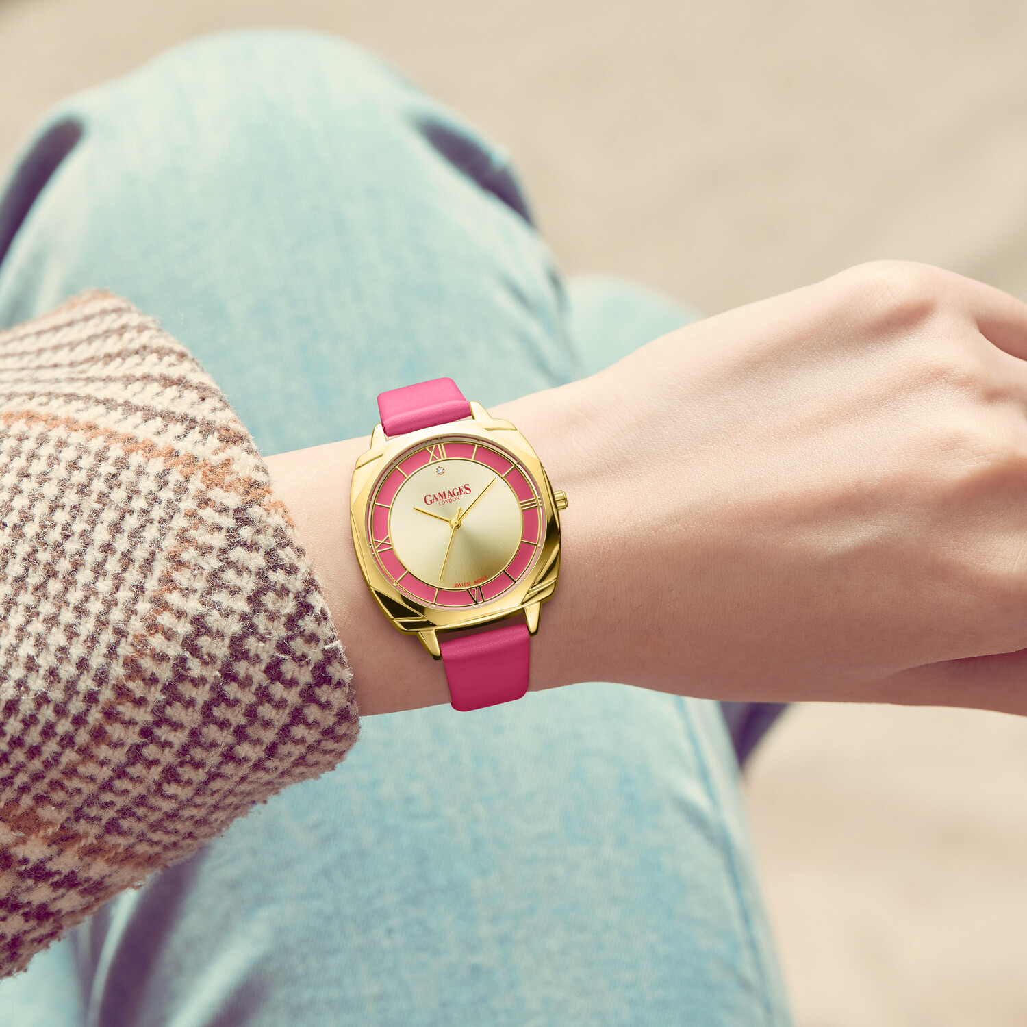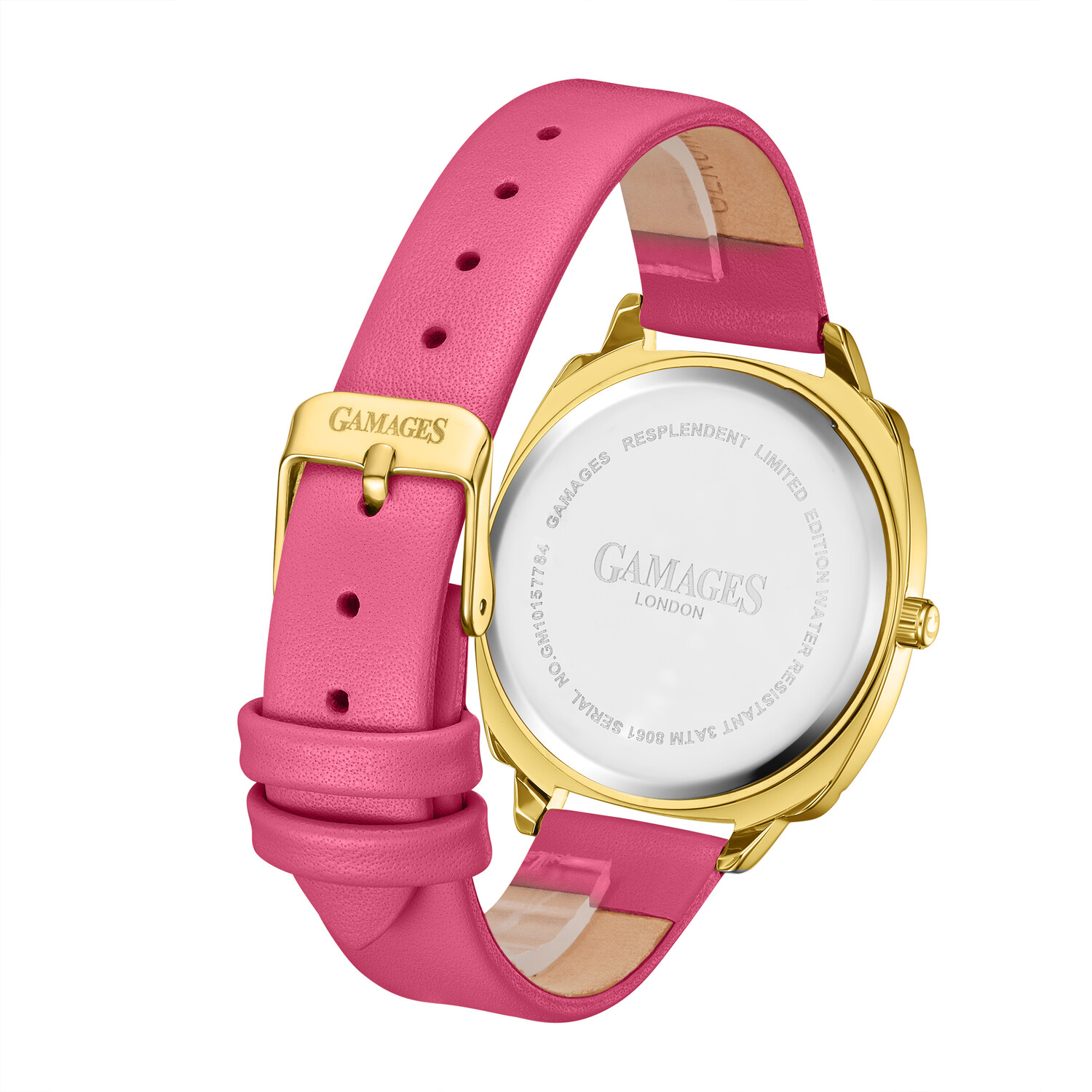 Completing the timepiece, the raspberry leather strap brings a complementing aura, while the Gamages Of London logo-engraved stainless steel caseback hints at the quality and authenticity that conjures confidence and makes you understand the importance of pursuing a dream.