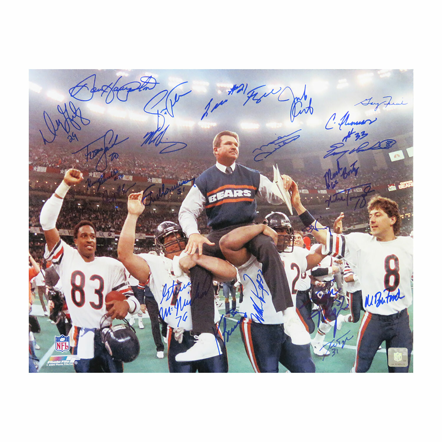 — Hand Signed By Mike Ditka, Mike Singletary, Dan Hampton, Steve McMichael, Gary Fencik, William Perry, Jay Hilgenberg, Leslie Frazier, Jim Covert, Mark Bortz, Tom Thayer, Steve Fuller, Mike Tomczak, Kevin Butler, Henry Waechter, Emery Moorehead, Denis Gentry, Reggie Phillips, Jim Morrissey, Maury Buford, Calvin Thomas, Thomas Sanders, & Ken Taylor