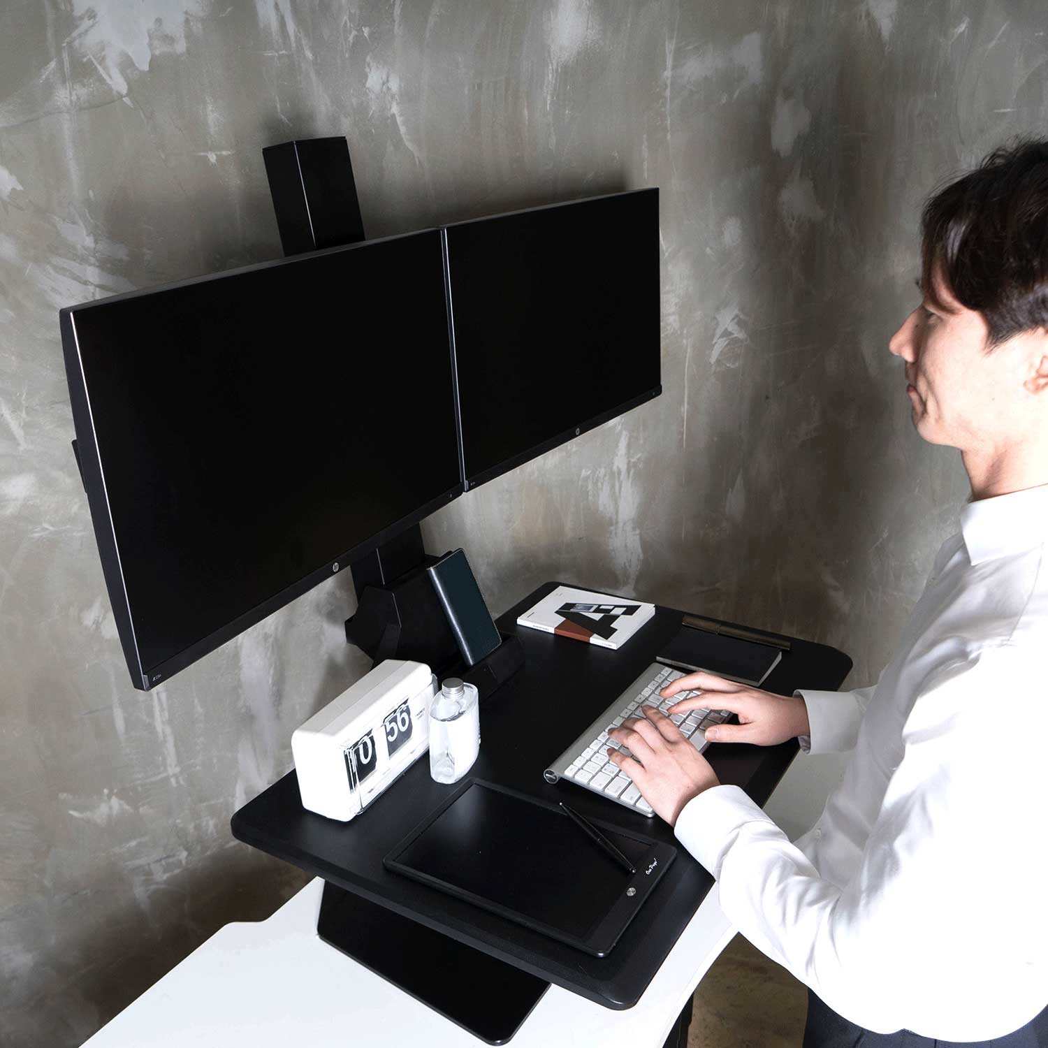 The GAZEDESK Workstation Duo creates an ergonomic working environment that gives you the power to adjust your desk from a sitting desk, to a standing desk at your choice of heights, at just the touch of a button. Simply place it on top of any existing desk, and you're ready to stand.