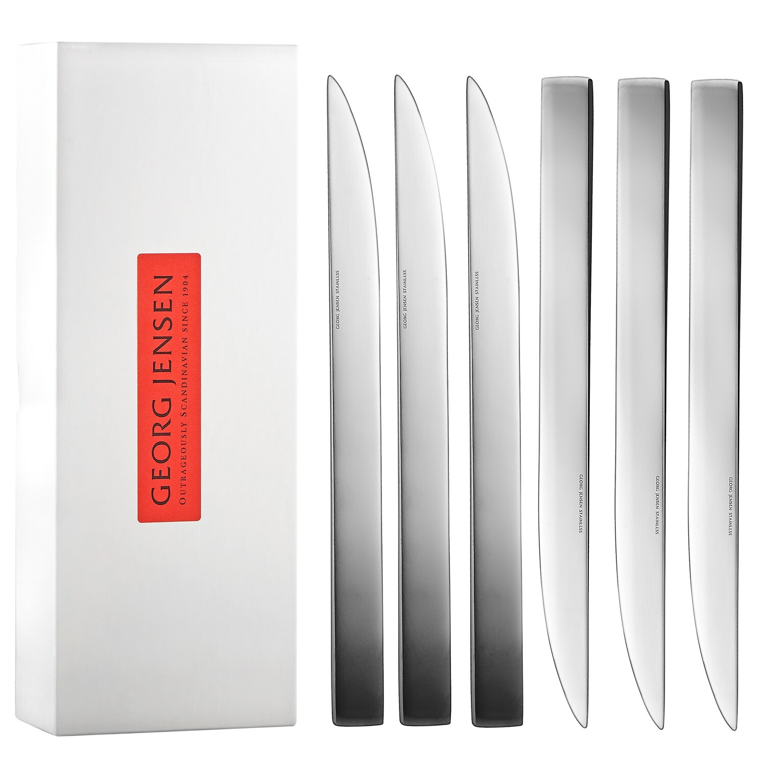 With the sleek, understated design offering a distinctly contemporary feel, this Jean Nouvel set from Georg Jensen will make for an exquisite housewarming gift or an exceptional part of your dinner table arrangement for a special occasion. The set includes six knives made of stainless steel. Set of 6.